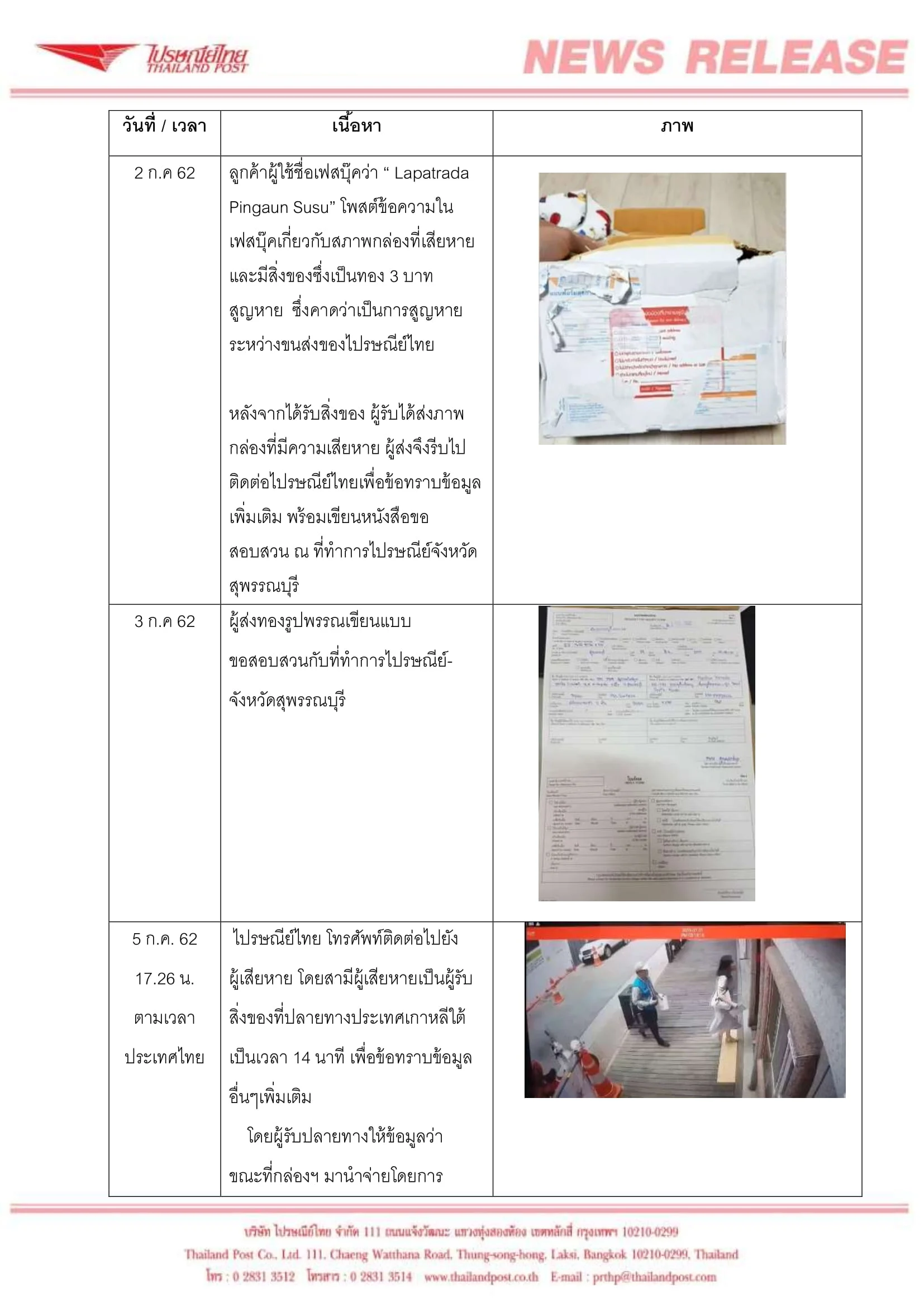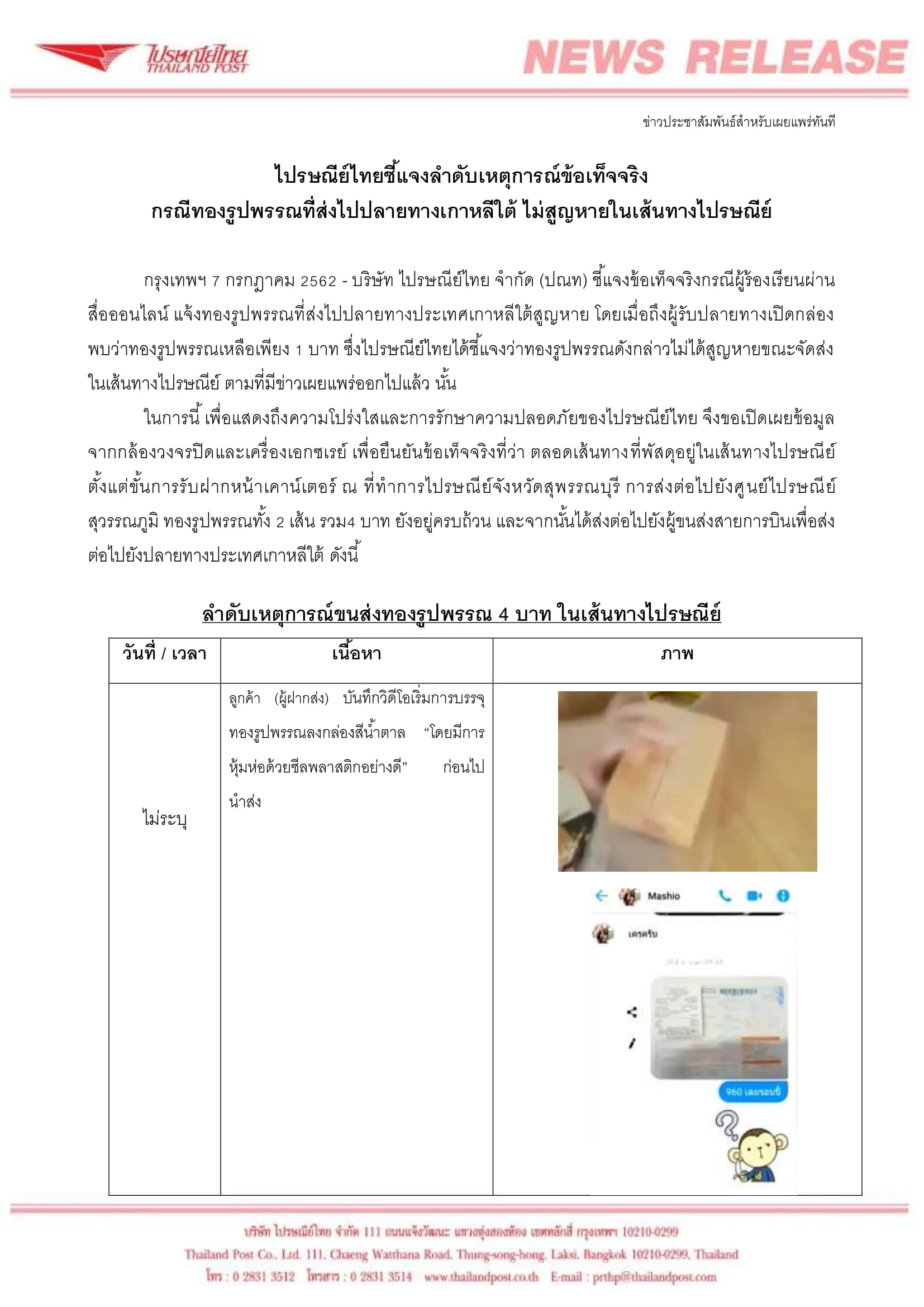 วันที่ 7 ก.ค. 62 นางสมร เทิดธรรมพิบูล กรรมการผู้จัดการใหญ่ บริษัท ไปรษณีย์ไทย จำกัด กล่าวถึง กรณีผู้ร้องเรียนผ่านสื่อออนไลน์ ว่าส่งทองรูปพรรณ ผ่านไปรษณีย์ไทย ไปที่ปลายทางประเทศเกาหลีใต้ 4 บาท แต่เมื่อถึงผู้รับปลายทางเปิดกล่องพบว่าทองรูปพรรณเหลือเพียง 1 บาท