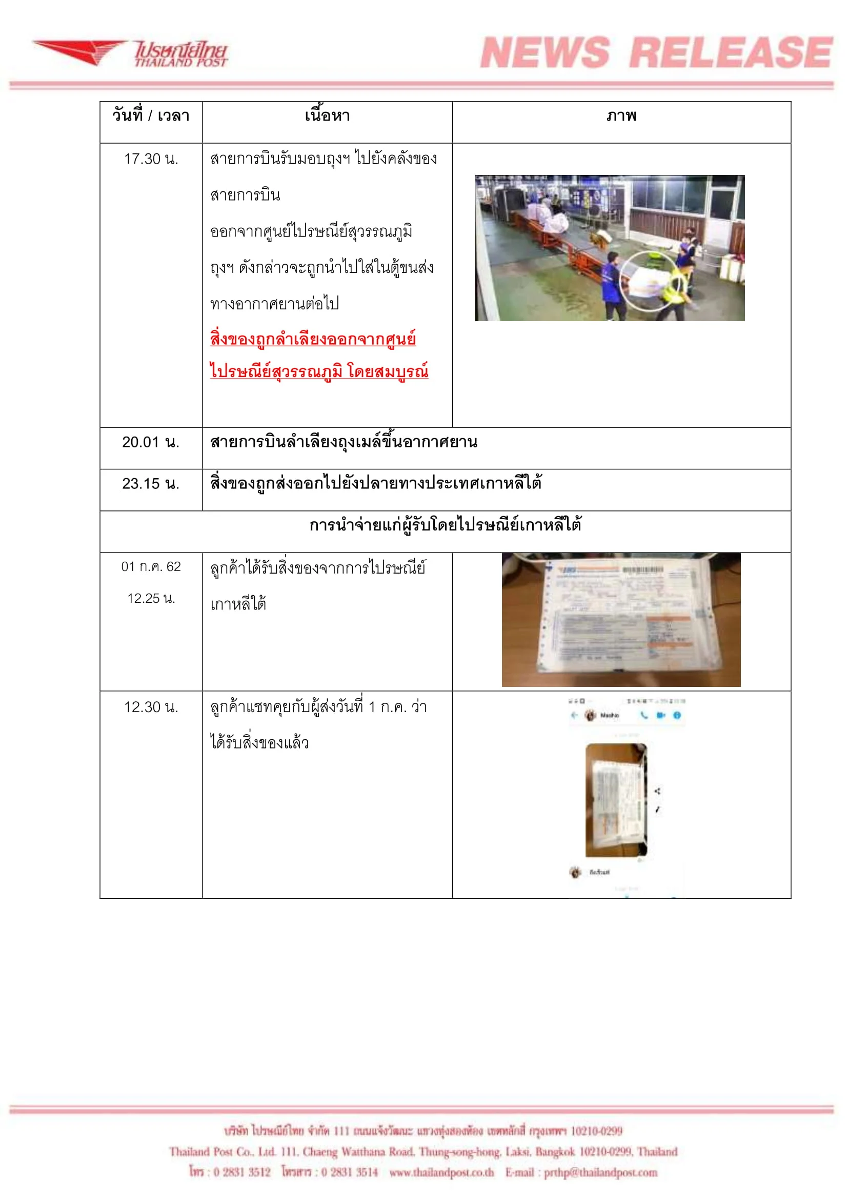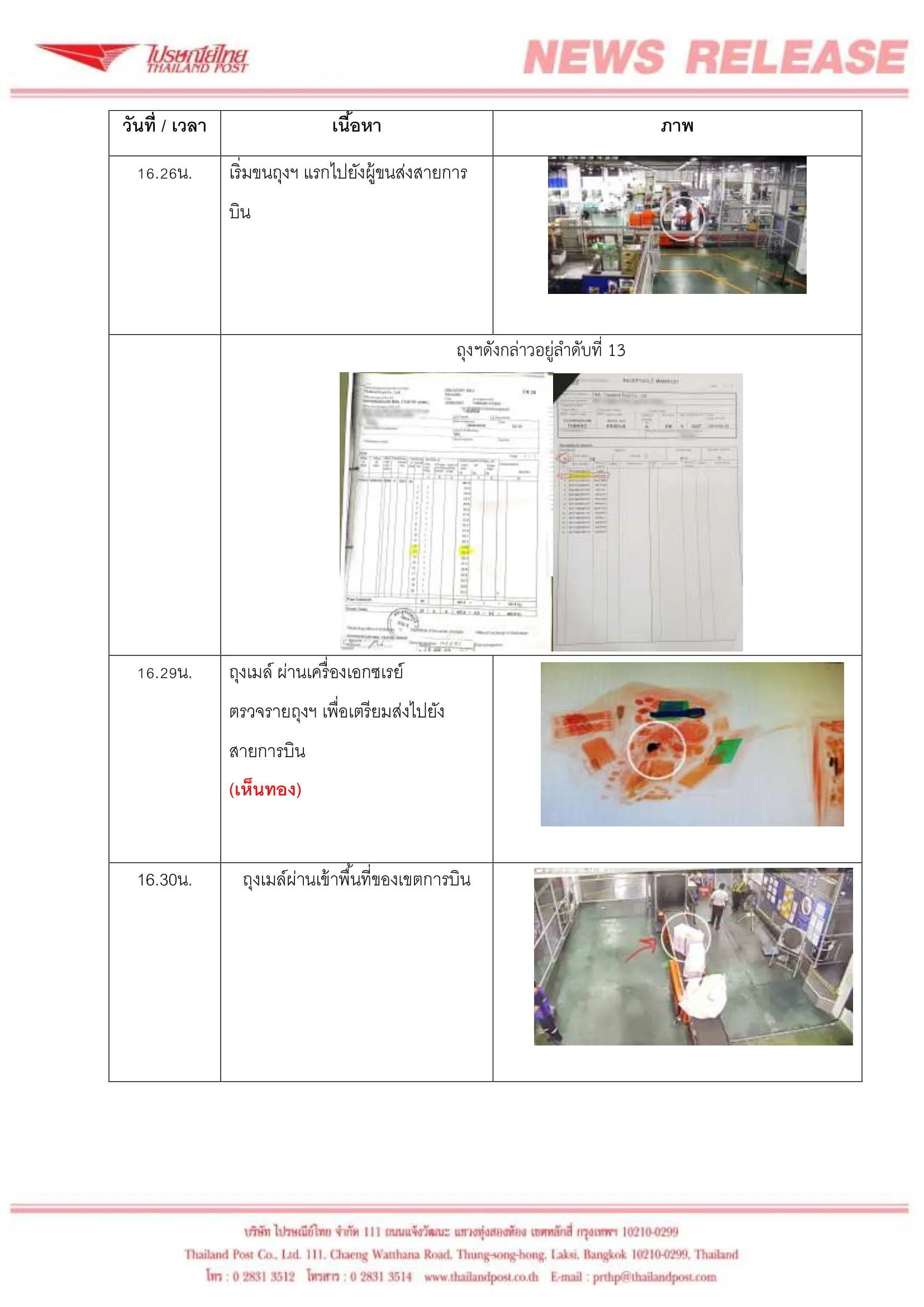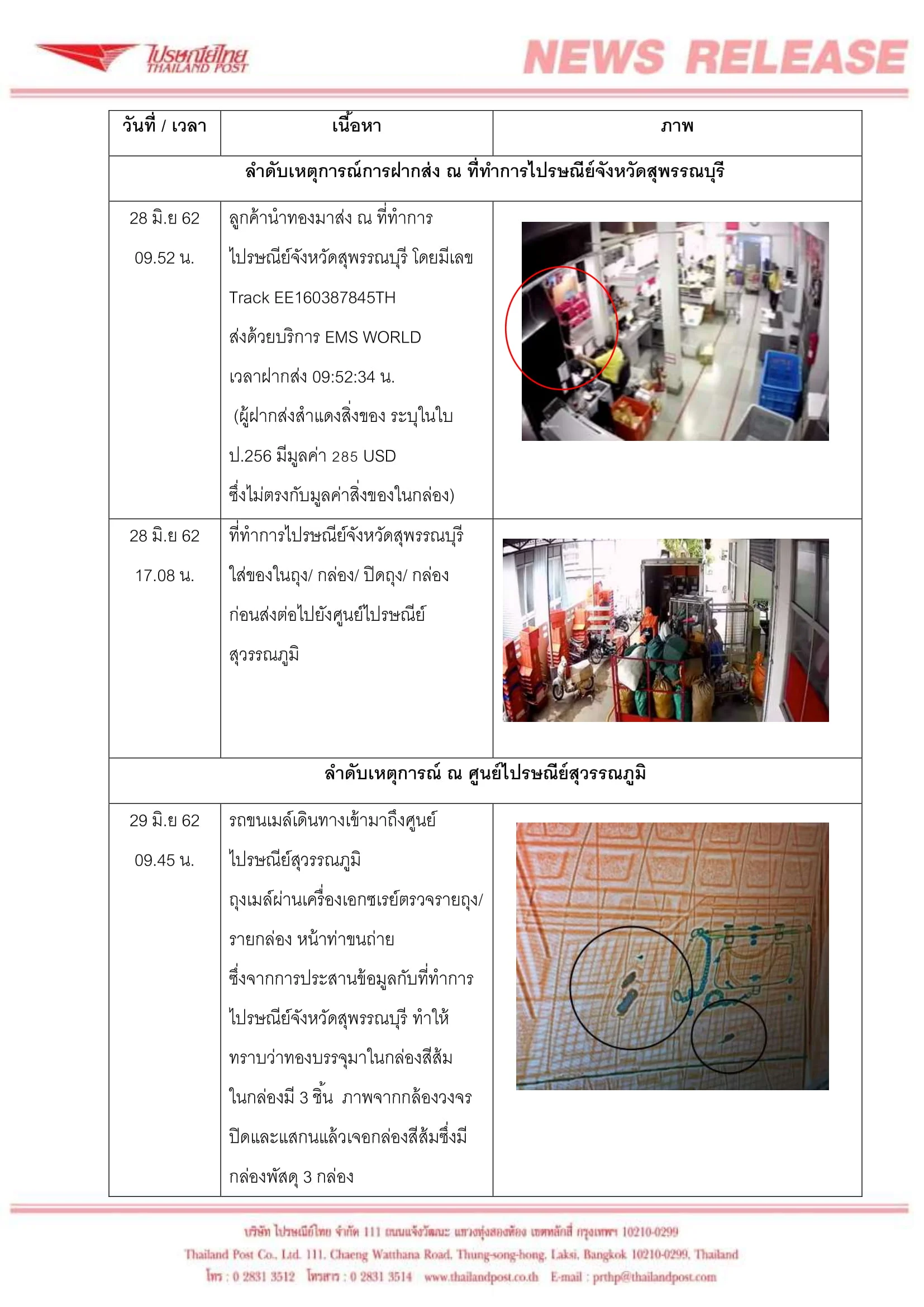 - วันที่ 29 มิ.ย.62 เวลา 45 น. สิ่งของถูกลำเลียงมายังศูนย์ไปรษณีย์สุวรรณภูมิ โดยตลอดการลำเลียงสิ่งของ ทองรูปพรรณไม่ได้หายในเส้นทางไปรษณีย์โดยตรวจสอบผ่านกล้องวงจรปิดทุกจุด ณ ศูนย์ไปรษณีย์สุวรรณภูมิ ได้แก่เวลา 09.56 น. ทำการเอ็กซเรย์แบบรายถุง เวลา 10.13 น. ทำการเอ็กซเรย์กล่องไปรษณีย์แบบรายชิ้นในขั้นตอนการคัดแยก และเวลา 16.29 น. ทำการเอ็กซเรย์แบบรายถุง