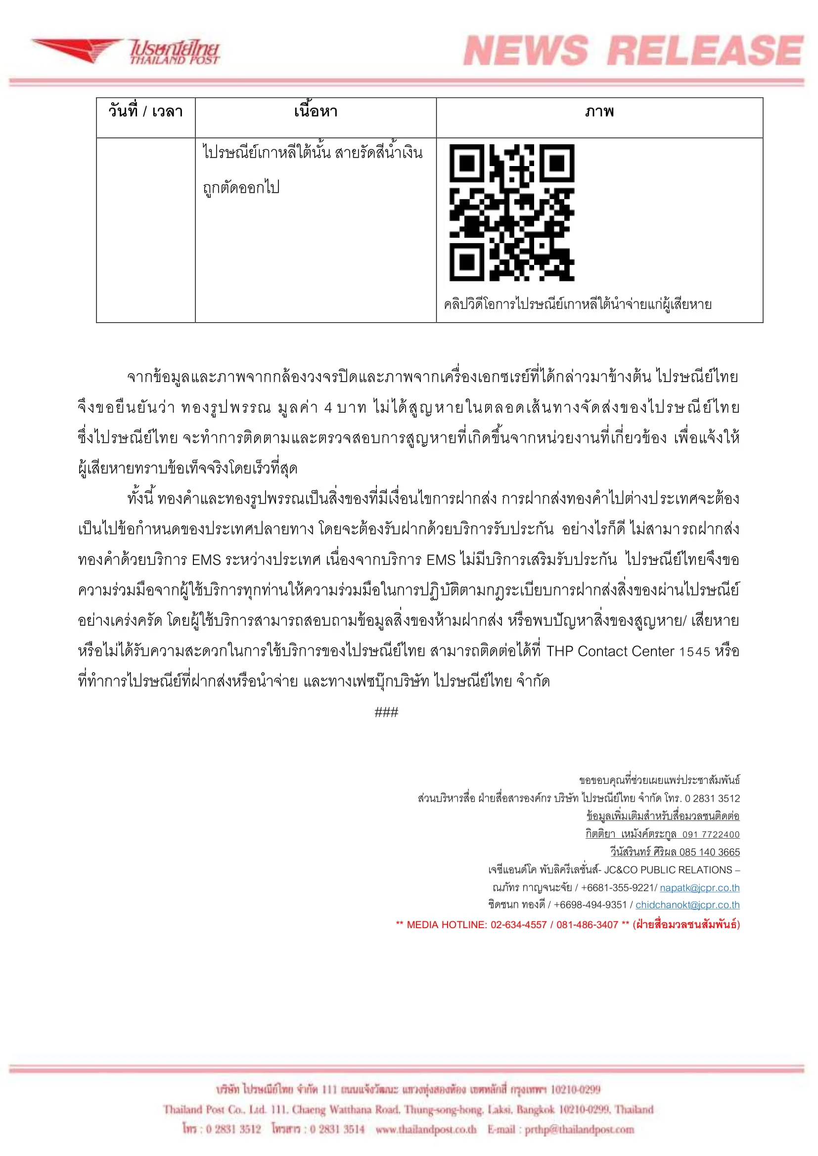 จากการตรวจสอบภาพจากกล้องวงจรปิดและภาพจากเครื่องเอ็กซเรย์พบว่า ทองรูปพรรณทั้ง 2 เส้น รวม 4 บาท ที่บรรจุในกล่องไปรษณีย์ยังอยู่ครบถ้วนสมบูรณ์ ดังนั้น ไปรษณีย์ไทย ยืนยันว่าทองรูปพรรณทุกชิ้นของผู้เสียหายไม่ได้สูญหายในเส้นทางไปรษณีย์ ซึ่งทุกกระบวนการโปร่งใสและสามารถตรวจสอบตามหลักฐานที่ได้ทำการบันทึกไว้ได้