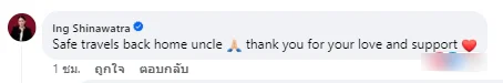 จากนั้น น.ส.แพทองธาร ชินวัตร หัวหน้าพรรคเพื่อไทย ได้เข้ามาคอมเมนต์ที่โพสต์ของสมเด็จฮุน เซน โดยโพสต์ข้อความเป็นภาษาอังกฤษ ระบุว่า “เดินทางกลับบ้านโดยสวัสดิภาพนะคะคุณลุง ขอบคุณสำหรับความรักและกำลังใจค่ะ”