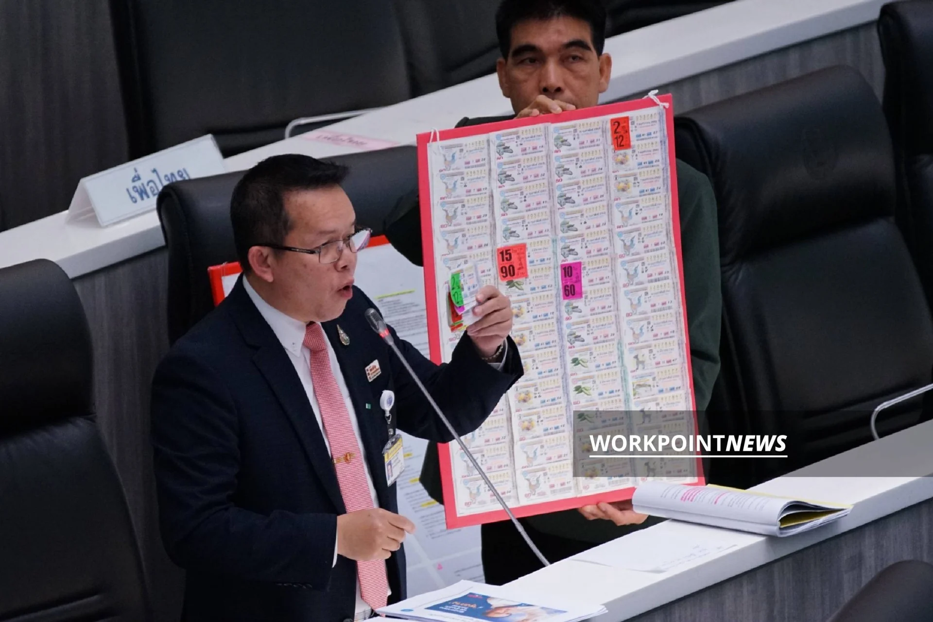 ส่วนเรื่องเงินรายได้จากการค้าสลากกินแบ่งรัฐบาล ยอมรับว่า ก่อนเข้าสู่การเป็น ส.ส. ตนมีอาชีพเป็น 1 ใน 5 เสือกองสลาก แต่มันผิดหรือครับที่ตนมีอาชีพผู้ค้าสลากรายใหญ่ อย่ามองเห็นผู้ค้าสลากรายใหญ่เป็นโจรเอารัดเอาเปรียบทางสังคม 5 เสือกองสลากก็มีคุณธรรม ไม่ใช่เอาเปรียบ แต่เมื่อนโยบายรัฐบาลชุดที่แล้วไม่ให้มี 5 เสือหรือผู้จำหน่ายสลากรายใหญ่ ก็ได้ยุติการเป็นคู่สัญญากับกองสลาก เมื่อ 4 ส.ค. 2558