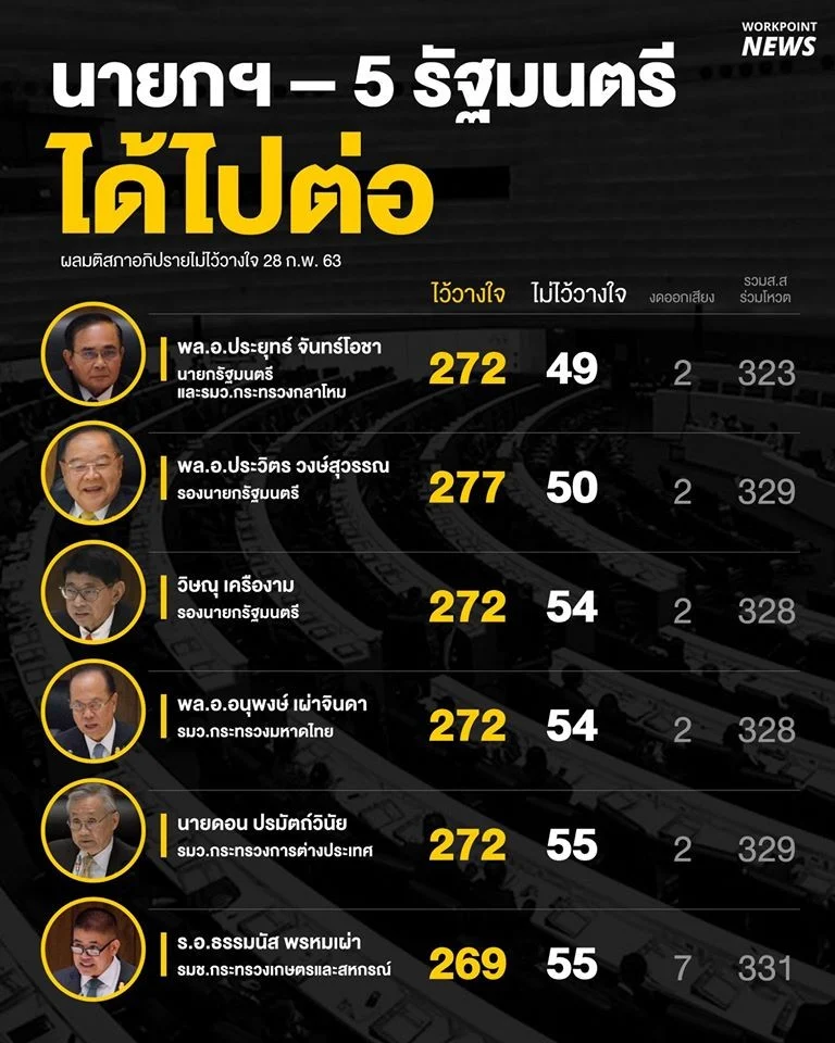 การอภิปรายไม่ไว้วางใจ พล.อ.ประยุทธ์ จันทร์โอชา นายกรัฐมนตรีและ รมว.กลาโหม กับอีก 5 รัฐมนตรี จบลงโดยทุกคนได้รับเสียงไว้วางใจเกินครึ่งหนึ่งของสภาอยู่ในตำแหน่งต่อไปได้ตามความคาดหมาย