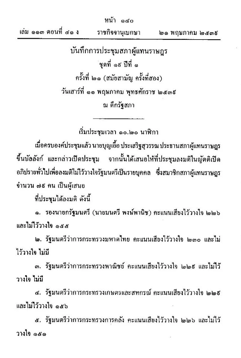 ทำให้เสียงไว้วางใจ ได้น้อยที่สุดในบรรดา 6 รัฐมนตรี คือ ไว้วางใจ 269 เสียง งดออกเสียง 7 เสียง ขณะที่ พล.อ.ประวิตร วงษ์สุวรรณ รองนายกรัฐมนตรี ได้ไว้วางใจ 277 เสียง งดออกเสียง 2 ส่วนคนอื่นๆ ไว้วางใจ 272 งดออกเสียง 2