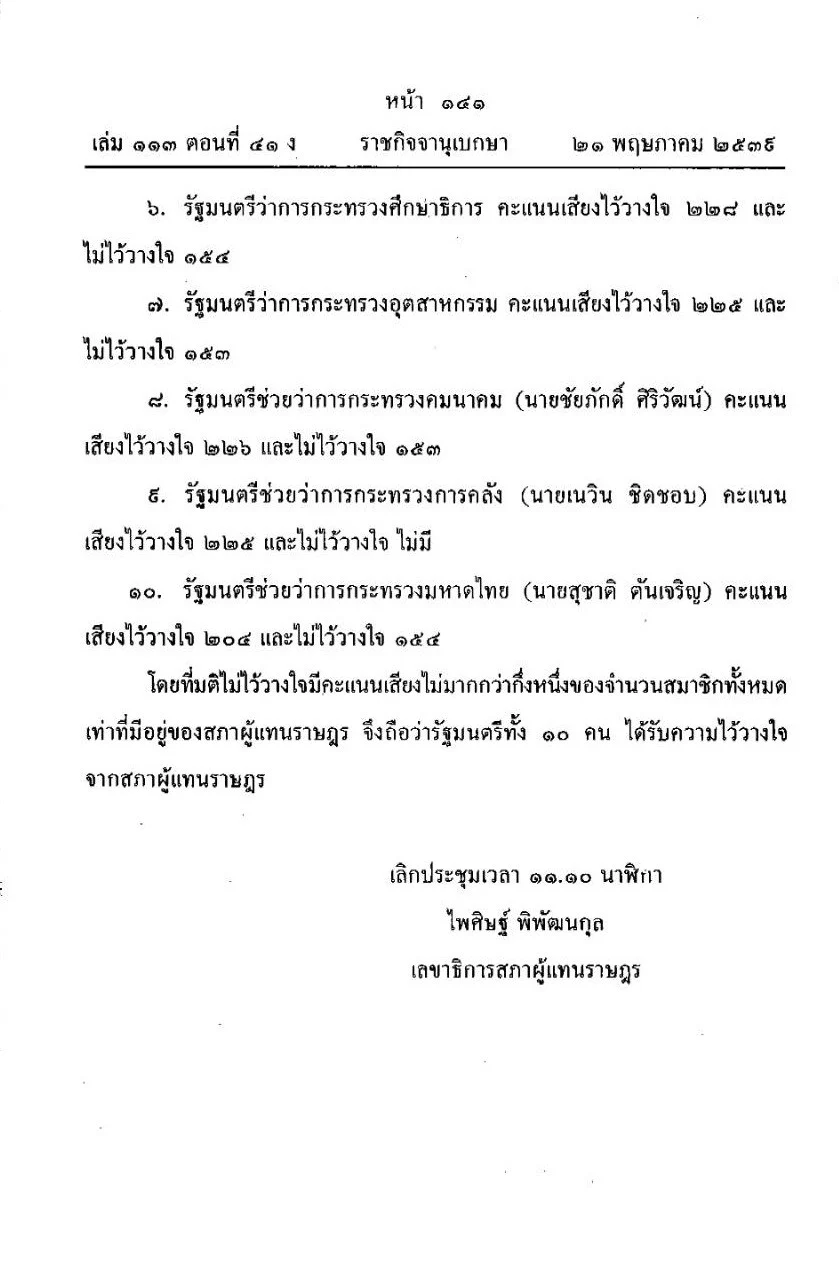 ผู้ที่ได้คะแนนน้อยที่สุดคือ นายสุชาติ ได้คะแนนไว้วางใจ 204 และไม่ไว้วางใจ 154 โดยพรรคพลังธรรม ที่เป็นพรรคร่วมรัฐบาลนำโดย พ.ต.ท.ทักษิณ ชินวัตร ไม่ลงคะแนนให้ ขณะที่รัฐมนตรีคนอื่นๆ ได้คะแนนไว้วางใจอยู่ที่ 225-230 ห่างกันประมาณ 21 เสียง