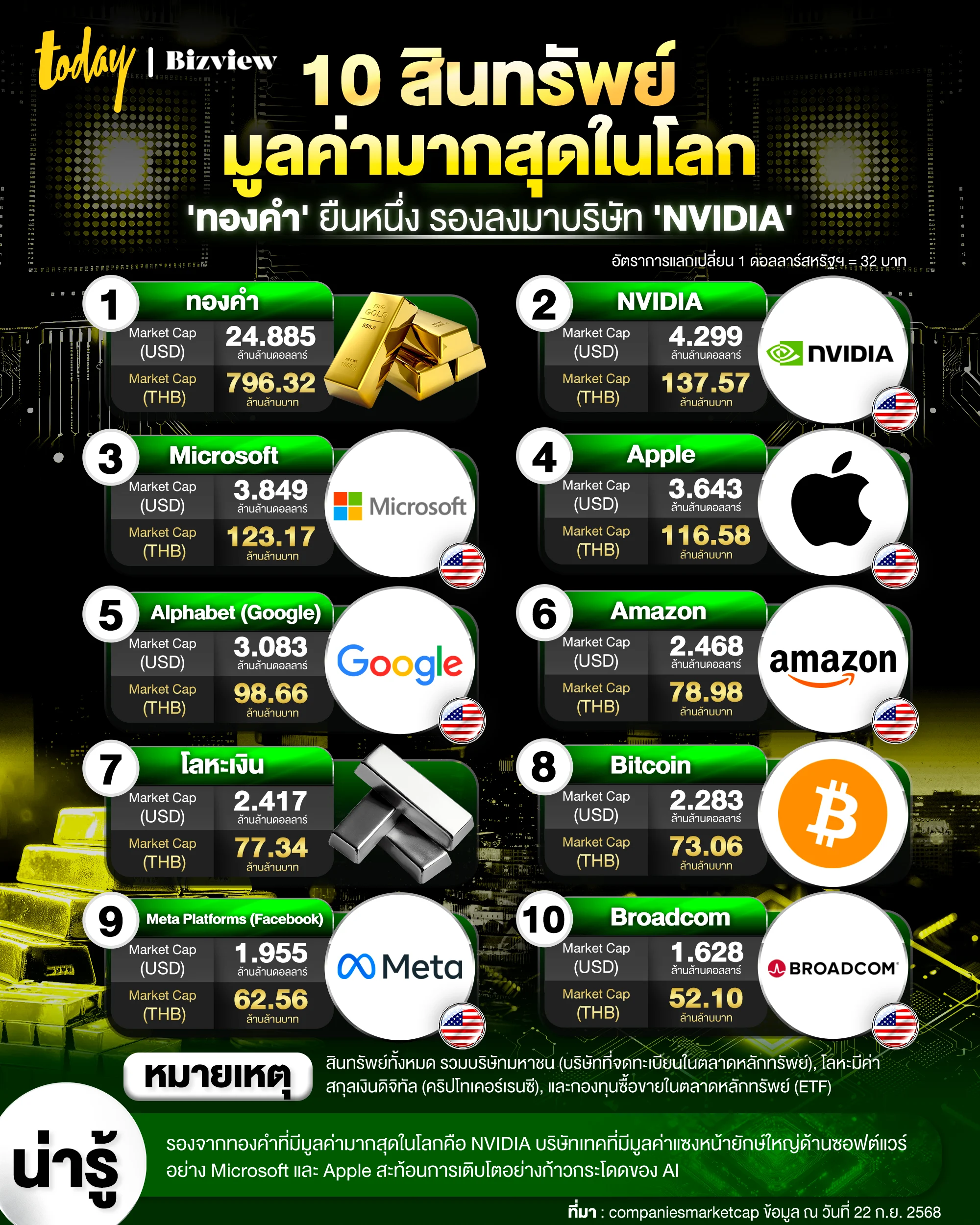 ในโลกการเงินและการลงทุน สินทรัพย์ที่มีมูลค่ามากที่สุดยังคงเป็น “ทองคำ” ที่ครองอันดับหนึ่ง ด้วยมูลค่าตลาดสูงถึงเกือบ 25 ล้านล้านดอลลาร์สหรัฐ หรือกว่า 796 ล้านล้านบาท ทองคำในฐานะสินทรัพย์ปลอดภัยที่นักลงทุนทั่วโลกให้ความเชื่อมั่น