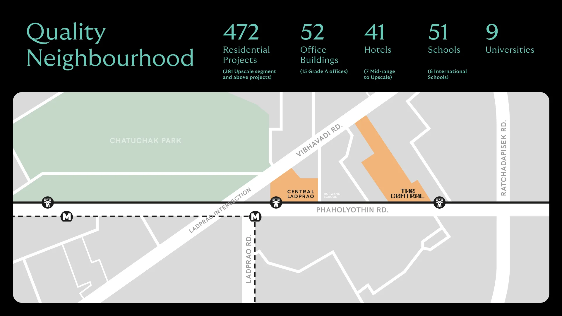 The Central พหลโยธิน จึงรายล้อมไปด้วยสิ่งอำนวยความสะดวกมากมาย ทั้งที่อยู่อาศัยกว่า 472 โครงการ (กว่าครึ่งเป็น Upper Segment), อาคารสำนักงาน 52 แห่ง (15 แห่งเป็น Grade A), โรงเรียน 51 แห่ง, มหาวิทยาลัย 9 แห่ง, และ โรงแรม 41 แห่ง สะท้อนศักยภาพย่านที่พร้อมเติบโตเป็นศูนย์กลางธุรกิจ–ไลฟ์สไตล์–วัฒนธรรมแห่งใหม่ของเมือง