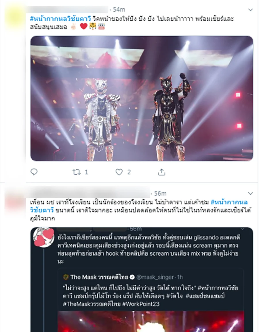 เรียกได้ว่าได้ใจไปเต็มๆ นอกจากนี้ ยังมีเด็กๆ มาร่วมร้องในท่อนคอรัสซึ้งๆ ผนวกกับจังหวะดนตรีที่เรียกได้ว่าสร้างความประทับใจให้กับผู้ชมผู้ฟังสุดๆ ที่สำคัญคือการร้องของทั้งสองที่สัมผัสได้ถึงความทุ่มเทของทั้งคู่ ที่ปลุกความรู้สึกผู้ชมจนเวทีลุกเป็นไฟ จนหลายคนอยากจะกดโหวตให้ แต่ทำไม่ได้ ทุกคนจึงพร้อมใจกันติดแฮชแท็ก “#หน้ากากหลวิชัยคาวี” เพื่อส่งกำลังใจไปเชียร์ จนกระทั่ง “#หน้ากากหลวิชัยคาวี” พุ่งติดเทรนด์ทวิตเตอร์เป็นอันดับ 1 ของประเทศไทยอย่างรวดเร็ว