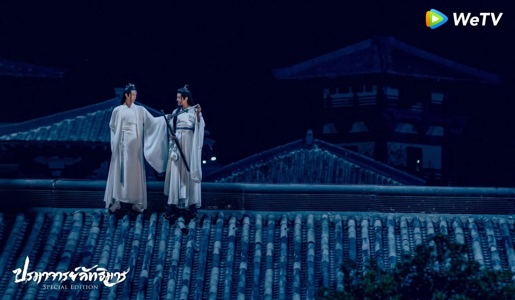 ฉากนี้อยู่ตอนที่ 3 เป็นเหตุการณ์ที่เว่ยอิงแอบลักลอบเข้า กูซู (อวิ๋นเซินปู้จื้อฉู่) ในช่วงกลางดึก มาพร้อมกับสุราเทียนจื้อเสี่ยว และยังทำผิดกฏของตระกูลหลานอีกหลายข้อ ทำให้หลานจ้านได้พยายามตามเว่ยอิงให้ไปรับโทษ จนเกิดประลองการต่อสู้กันบนหลังคา แต่เว่ยอิงก็ยังไม่ยอมและยังปีนขึ้นไปดื่มสุราบนหลังคา ทำให้หลานจ้านถึงกับเอ่ยปากบอกกับเว่ยอิงว่า “ช่างดื้อดึงยิ่งนัก”
