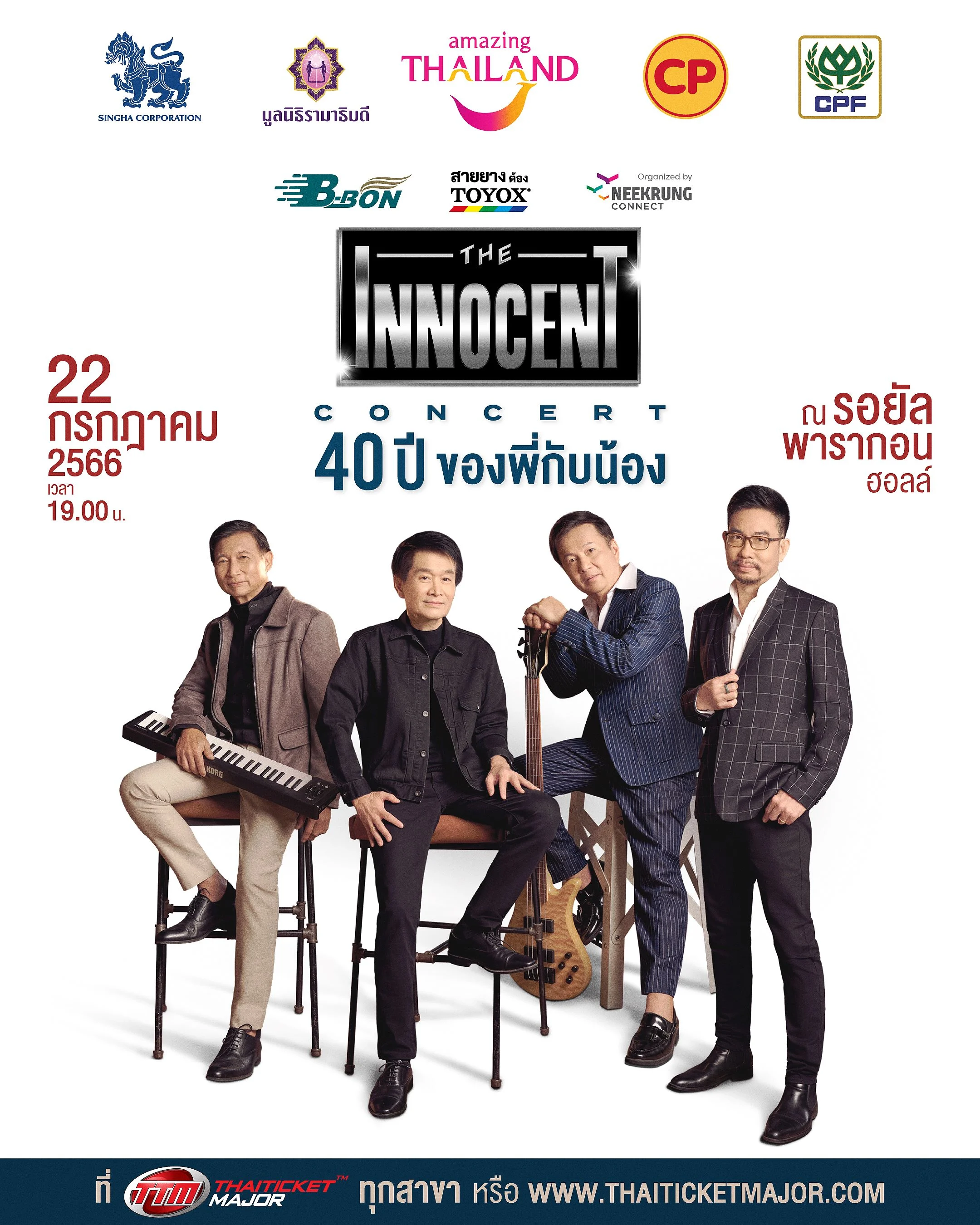 บริษัท หนีกรุง คอนเน็ค จำกัด ร่วมกับ การท่องเที่ยวแห่งประเทศไทย / บริษัท สิงห์ คอร์เปอเรชั่น จำกัด / บริษัท เครือเจริญโภคภัณฑ์ จำกัด และ บริษัท เจริญโภคภัณฑ์อาหาร จำกัด (มหาชน) ชวนแฟนตัวจริงนับถอยหลังสู่ “The Innocent Concert 40 ปีของพี่กับน้อง ” เตรียมตัวให้พร้อม มาร่วมร้อง ร่วมเต้นกับทุกเพลงโปรดจาก 9 อัลบั้มฮิตกับศิลปินในดวงใจที่กลับมารวมตัวกันในรอบ 14 ปี ของ ชาตรี คงสุวรรณ, สายชล ระดมกิจ, พีรสันติ จวบสมัย และ เสนีย์ ฉัตรวิชัย พร้อมแขกรับเชิญคุณภาพ ตูน บอดี้สแลม, ปู แบล็คเฮด, ติ๊ก ชิโร่, จั๊ก ชวิน พร้อม Special Duo สุดเซอร์ไพรส์