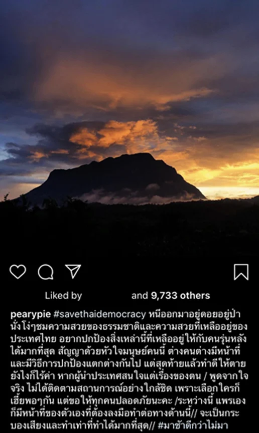 Blogger “Pearypie” Amta Chittasenee, posted on her Instagram with the hashtag #savethaidemocracy along with a caption stating that she will continue to support the movement hoping that everyone will stay safe.