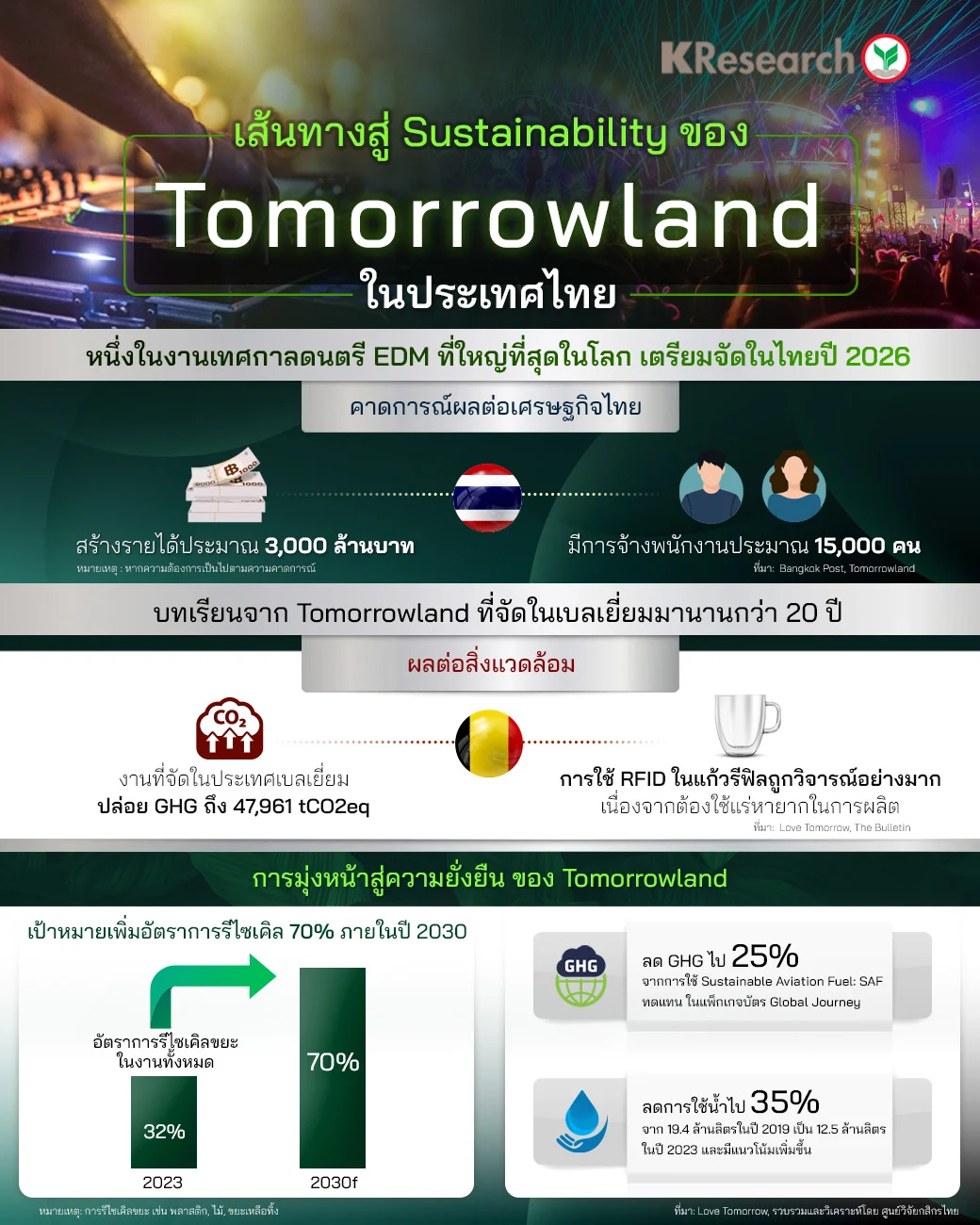 จนล่าสุด KReasearch (ศูนย์วิจัยกสิกรไทย) ได้ประเมินตัวเลขรายได้ที่ไทยจะได้รับ จากเทศกาล Tomorrowland ซึ่งก็ย้ำว่าเทศกาลดังกล่าวจะจัดขึ้นที่ไทยในปี 2026