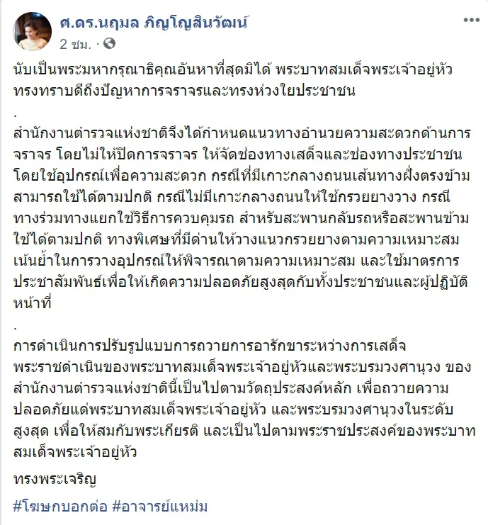 วันที่ 12 ม.ค. นางนฤมล ภิญโญสินวัฒน์ โฆษกรัฐบาล เปิดเผยว่า นับเป็นพระมหากรุณาธิคุณอันหาที่สุดมิได้ พระบาทสมเด็จพระเจ้าอยู่หัวทรงทราบดีถึงปัญหาการจราจรและทรงห่วงใยประชาชน