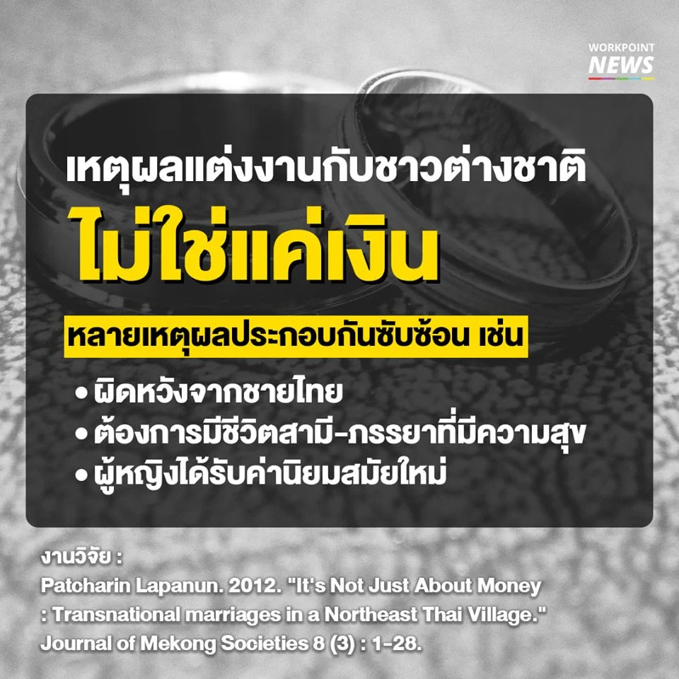 แต่งานวิจัยเรื่อง “ไม่ใช่เพียงเพราะเงิน: การแต่งงานข้ามชาติของผู้หญิงอีสาน” ของดร.พัชรินทร์ ลาภานันท์ ที่ลงพื้นที่หมู่บ้านแห่งหนึ่งในจังหวัดอุดรธานี แล้วสัมภาษณ์เชิงลึกคู่รักต่างสัญชาติ พิสูจน์ว่าเราเหมารวมอย่างนั้นไม่ได้เพราะมีเหตุผลมากมายซับซ้อนกว่านั้น