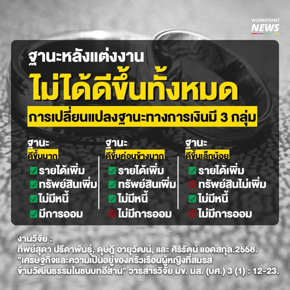 หลังจากอ่านงานวิจัยก่อนหน้าที่พิสูจน์ว่าเงินไม่ใช่ทุกอย่างในการแต่งงาน ทีมข่าวเวิร์คพอยท์พบงานวิจัยอีกชิ้นที่พิสูจน์ว่าการแต่งงานกับชาวต่างชาติไม่ได้ทำให้ฐานะทางเศรษฐกิจดีขึ้นเสมอไป