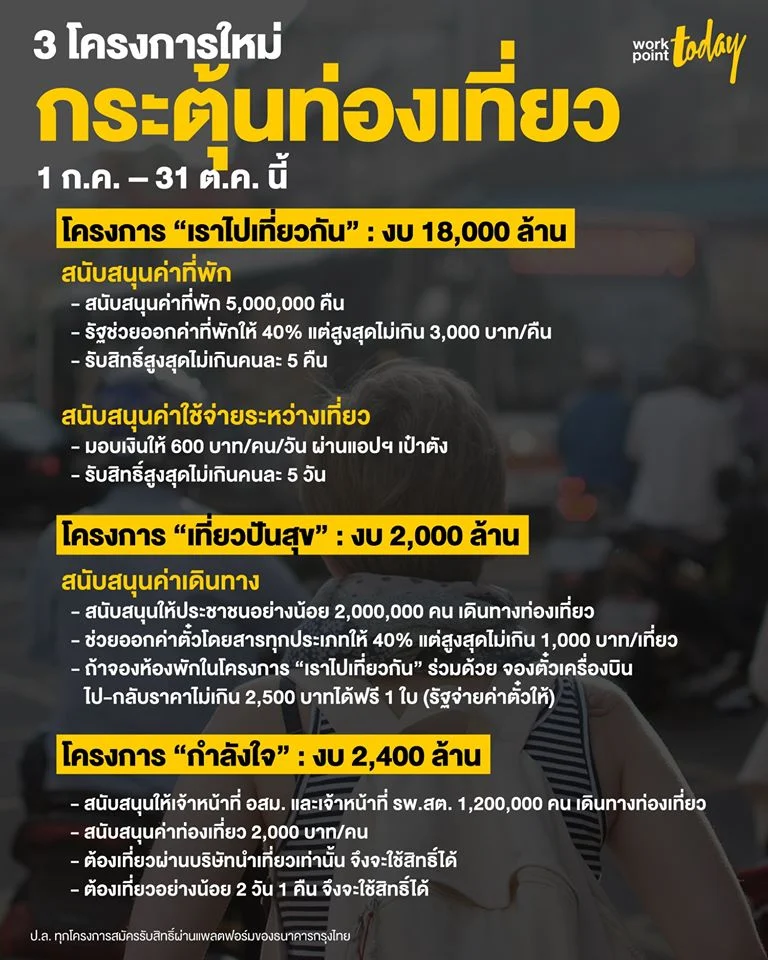 2.โครงการ “เราไปเที่ยวกัน” สำหรับประชาชนทั่วไป โดยรัฐบาลจะสนับสนุนค่าใช้จ่ายโรงแรมที่พักในอัตรา 40% ต่อคืน ไม่เกิน 3,000 พันบาทต่อคืน (นักท่องเที่ยวจ่าย 60%) สูงสุดไม่เกิน 5 คืน หรือ 15,000 บาท รวมโควตาทั้งโครงการ 5 ล้านคืน และสนับสนุนเงินในลักษณะวงเงินอีวอลเล็ท หรือเงินอิเล็กทรอนิกส์ ให้ 600 บาทต่อคืน สูงสุดไม่เกิน 5 คืน หรือ 3,000 บาท เพื่อให้นำไปใช้จ่ายกิจกรรมในด้านการท่องเที่ยวอื่น ๆ เช่น ใช้บริการสปา ซื้อของที่ระลึก ร้านอาหาร โดยจะต้องไปท่องเที่ยวในจังหวัดที่ต่างจากที่ตนเองมีทะเบียนบ้าน ใช้งบประมาณ 1.8 หมื่นล้านบาท