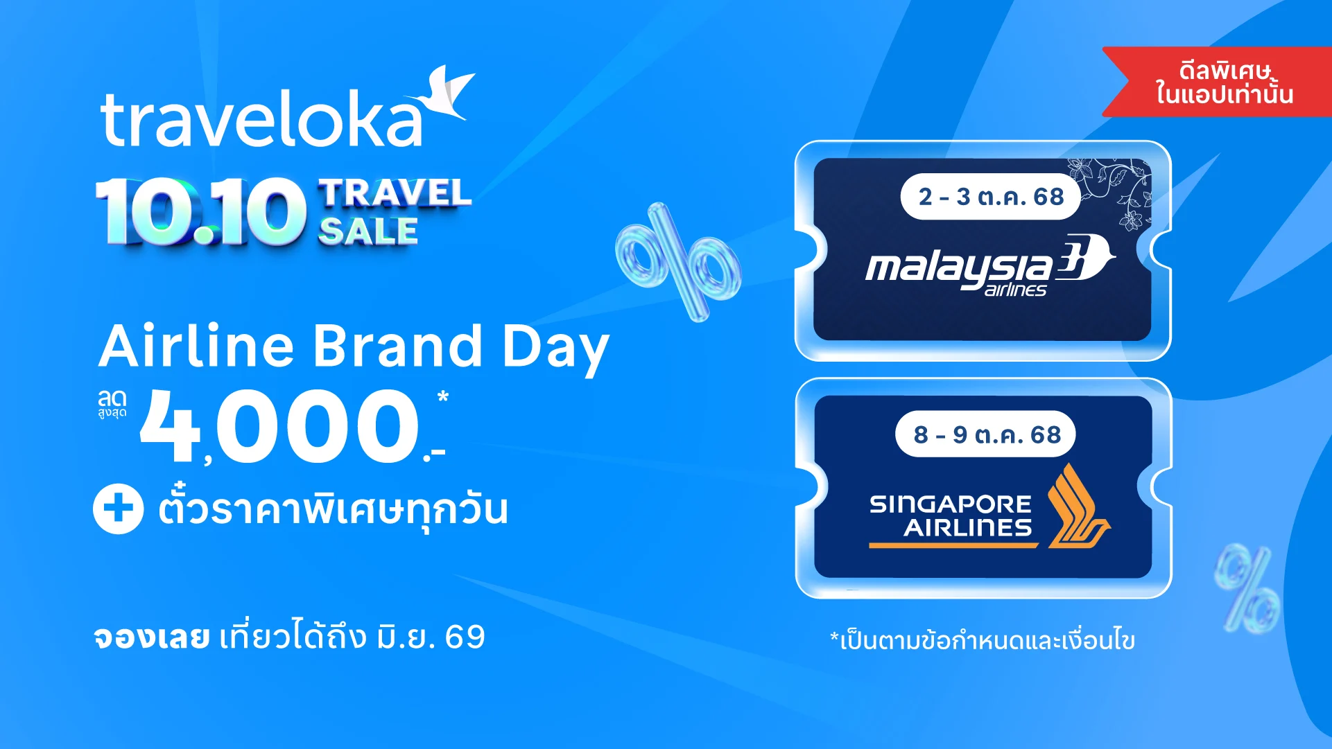 Traveloka แพลตฟอร์มการท่องเที่ยวครบวงจรชั้นนำแห่งเอเชียตะวันออกเฉียงใต้ ได้จับมือกับสายการบินพันธมิตร Malaysia Airlines และ Singapore Airlines เปิดตัว Airline Brand Day ภายใต้แคมเปญ 10.10 Travel Sale โดยมอบส่วนลดสูงสุดถึง 40% สำหรับเที่ยวบินระยะไกลและเที่ยวบินภายในภูมิภาคที่ร่วมรายการ