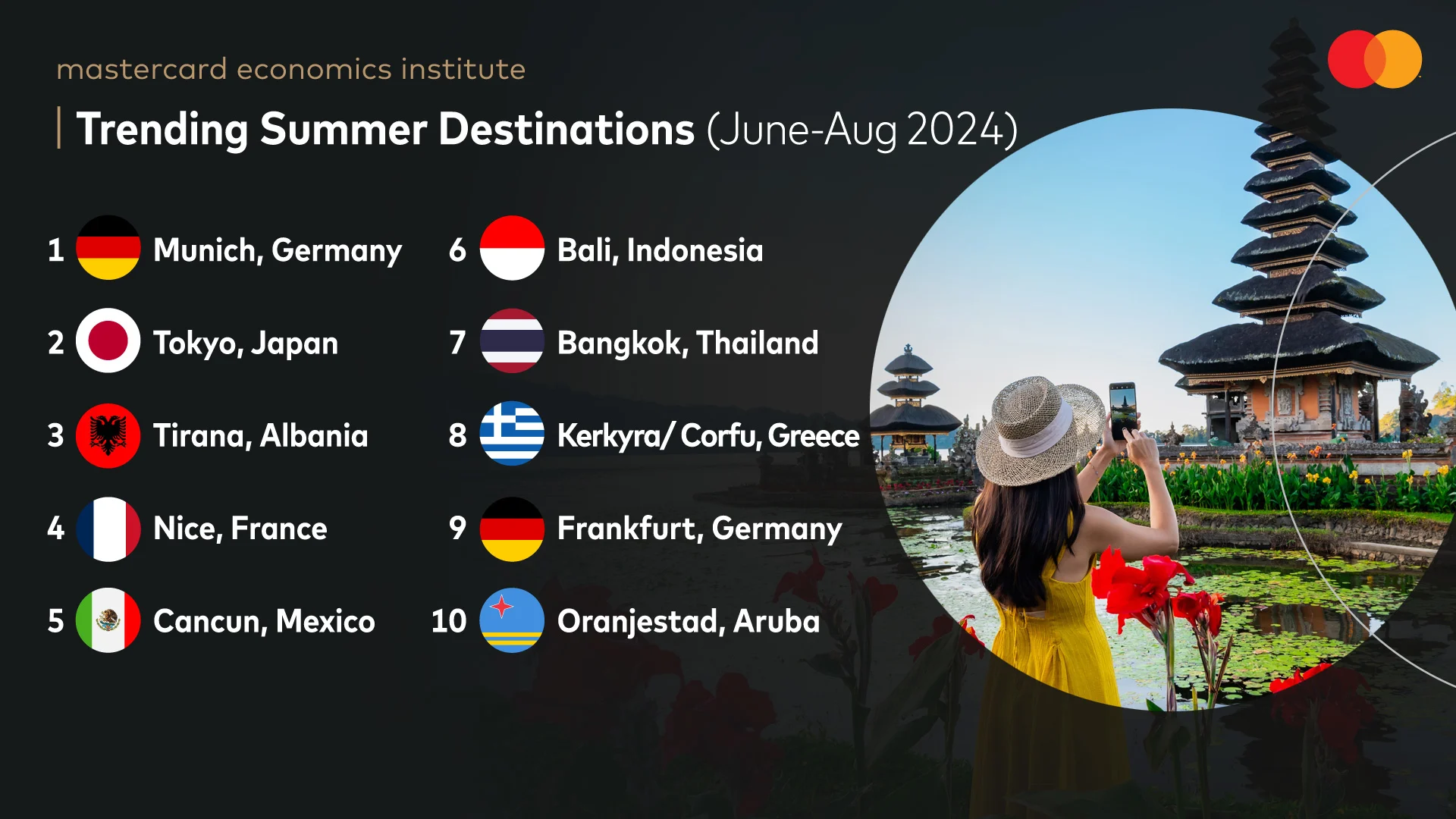 ถึงแม้ว่าญี่ปุ่นจะครองตำแหน่งประเทศจุดหมายปลายทางยอดนิยมในช่วง 12 เดือนที่ผ่านมา5 แต่คาดว่ามิวนิกจะขึ้นแท่นอันดับ 1 สำหรับการเป็นจุดหมายปลายทางประจำภาคฤดูร้อน (อ้างอิงจากการจองเที่ยวบิน) เนื่องจากมิวนิกได้เป็นเจ้าภาพจัดการแข่งขันฟุตบอลชิงแชมป์แห่งชาติยุโรปประจำปี 2567 ที่จะจัดขึ้นในเดือนมิถุนายน โดยโตเกียวก็ตีคู่กันมาติด ๆ ในขณะที่บาลี (อันดับที่ 6) และกรุงเทพฯ (อันดับที่ 7) ก็ติดอันดับหนึ่งใน 10 เมืองยอดนิยมที่นักท่องเที่ยวต้องการเดินทางไปเที่ยวเพิ่มขึ้นในอีกสามเดือนข้างหน้า