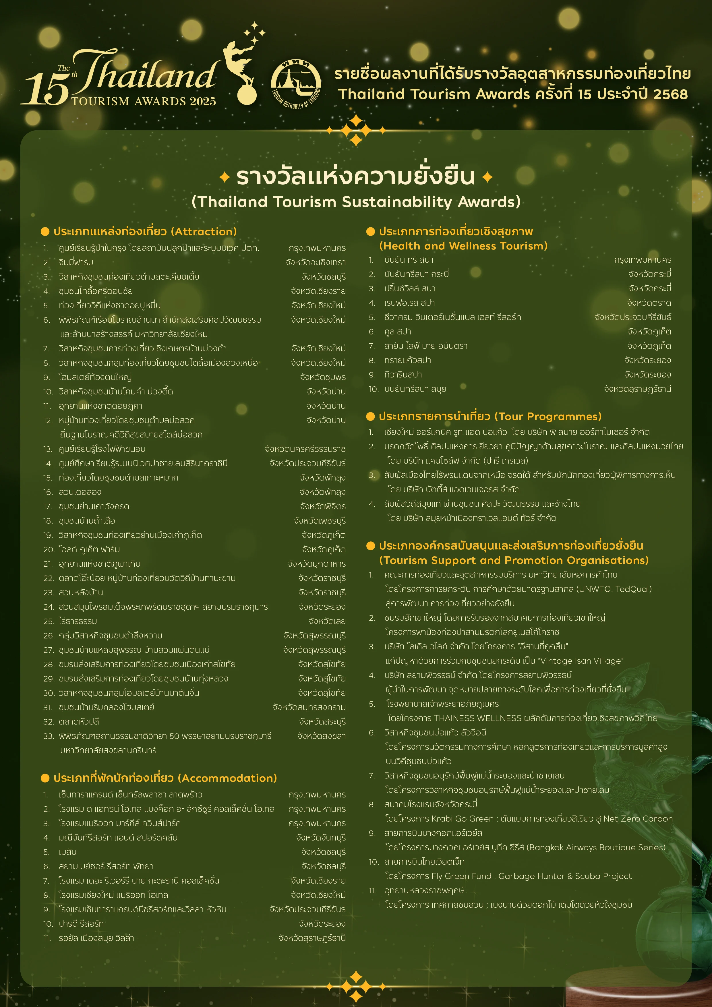 จนได้สุดยอดผู้ประกอบการด้านการท่องเที่ยวจำนวน 151 รางวัล โดยแบ่งระดับรางวัล ออกเป็น 4 ระดับ ได้แก่ รางวัลยอดเยี่ยม (Thailand Tourism Excellence Awards) จำนวน 17 รางวัล รางวัลดีเด่น (Thailand Tourism Outstanding Awards) จำนวน 59 รางวัล และความพิเศษของปีนี้คือ การเพิ่มรางวัลแห่งความยั่งยืน (Thailand Tourism Sustainability Awards) เป็นรางวัลที่มอบให้แก่ผู้ประกอบการที่มีความยอดเยี่ยมในการบริหารจัดการความยั่งยืน ซึ่งเป็นภาพสะท้อนถึงการให้ความสำคัญกับประเด็นระดับโลกในเรื่องการท่องเที่ยวอย่างยั่งยืน โดยมีผู้ได้รับรางวัลนี้จำนวน 69 รางวัล