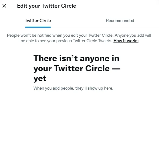 เมื่อกดเข้าไปแล้วจะปรากฏหน้าตาตามภาพข้างล่างนี้ 2 ตัวเลือก คือ ส่วนแรกจะบอกว่าคุณมีวงในเป็นใครบ้าง แต่หากยังไม่เลือกใคร ระบบจะแนะนำคนที่แอคเคาท์ตอบโต้ด้วยกันบ่อยๆ ขึ้นมา ตรง Recommended (คำแนะนำ) เราก็สามารถกดเพิ่มให้แอคเคาท์เข้ามาอยู่วงในของตัวเองได้ 150 คน โดยจะเป็นผู้ติดตามเราหรือไม่ก็ได้