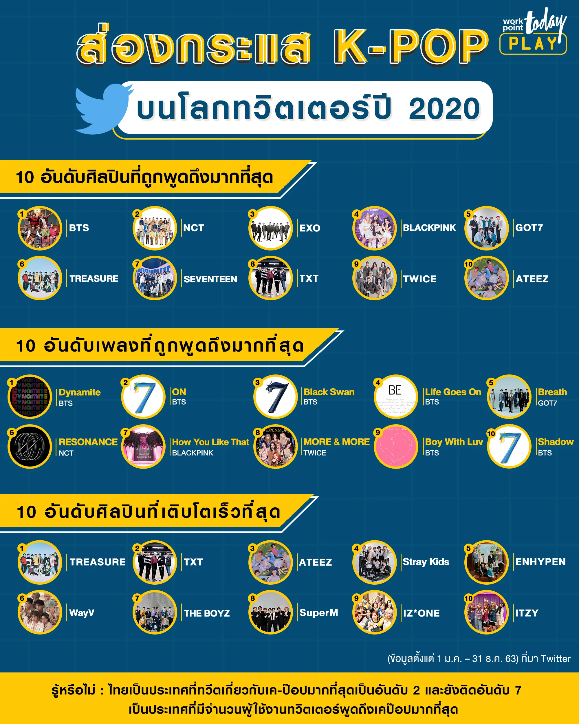 วันที่ 4 ก.พ. 2564 Twitter เผยข้อมูลเกี่ยวกับ #KpopTwitter ในปี 2020 ซึ่งเป็นข้อมูลตั้ง 1 ม.ค. 2563 ถึง 31 ธ.ค. 2563 พบว่า ไทยเป็นประเทศที่ทวีตเกี่ยวกับเค-ป๊อปมากที่สุดเป็นอันดับ 2 และยังติดอันดับ 7 เป็นประเทศที่มีจำนวนผู้ใช้งานทวิตเตอร์พูดถึงเคป๊อปมากที่สุด