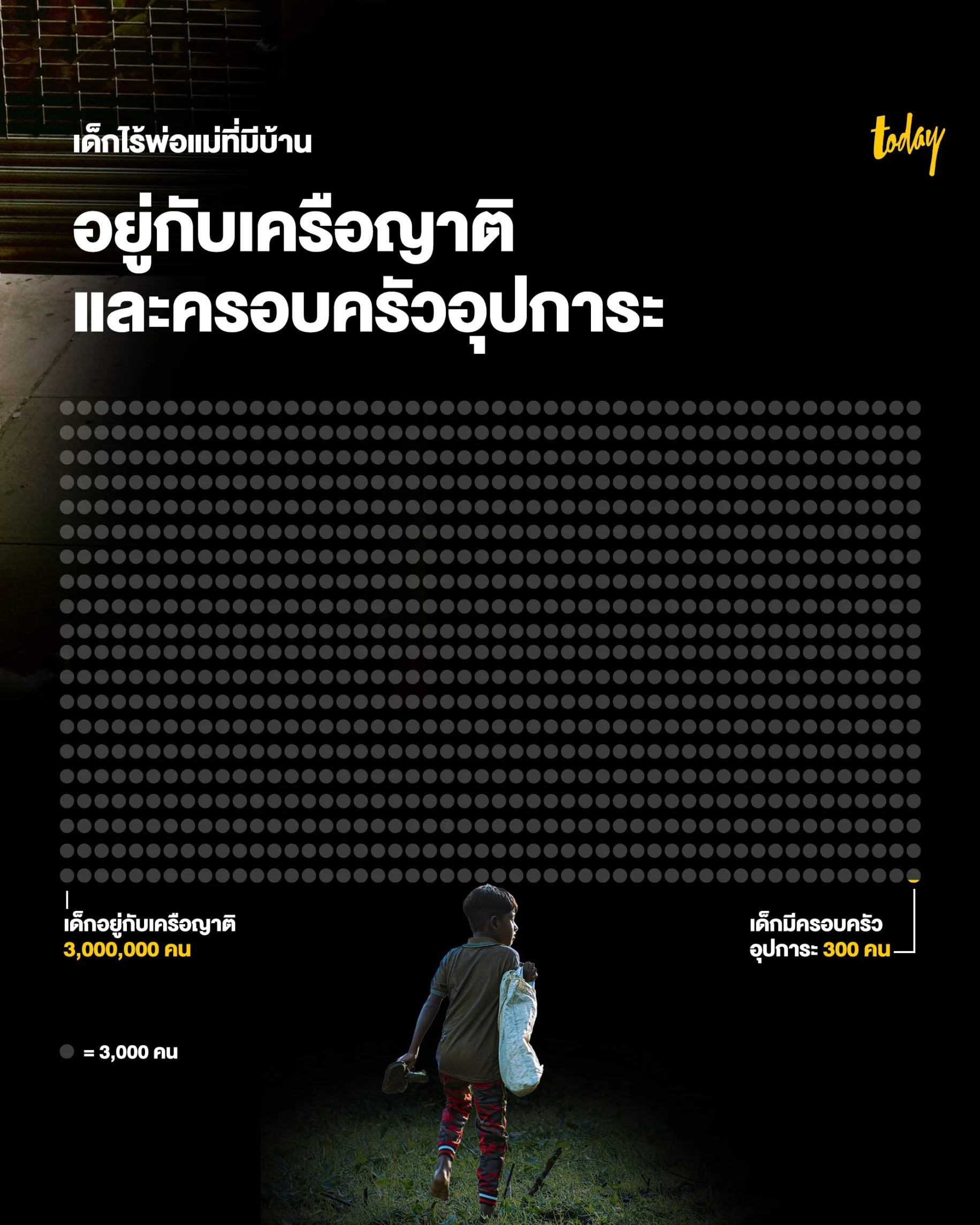 เด็กที่ไม่ได้เติบโตใน ‘ครอบครัว’ ตามภาพจำที่มีพ่อแม่ลูกมีอยู่ 2 แนวทาง แบ่งออกเป็น เด็กที่อยู่ในบ้านกับเครือญาติหรือครอบครัวอุปถัมภ์ที่มีอยู่ถึง 3 ล้านคน และเด็กอีก 150,000 คนอยู่ในสถานที่ไม่ใช่บ้าน