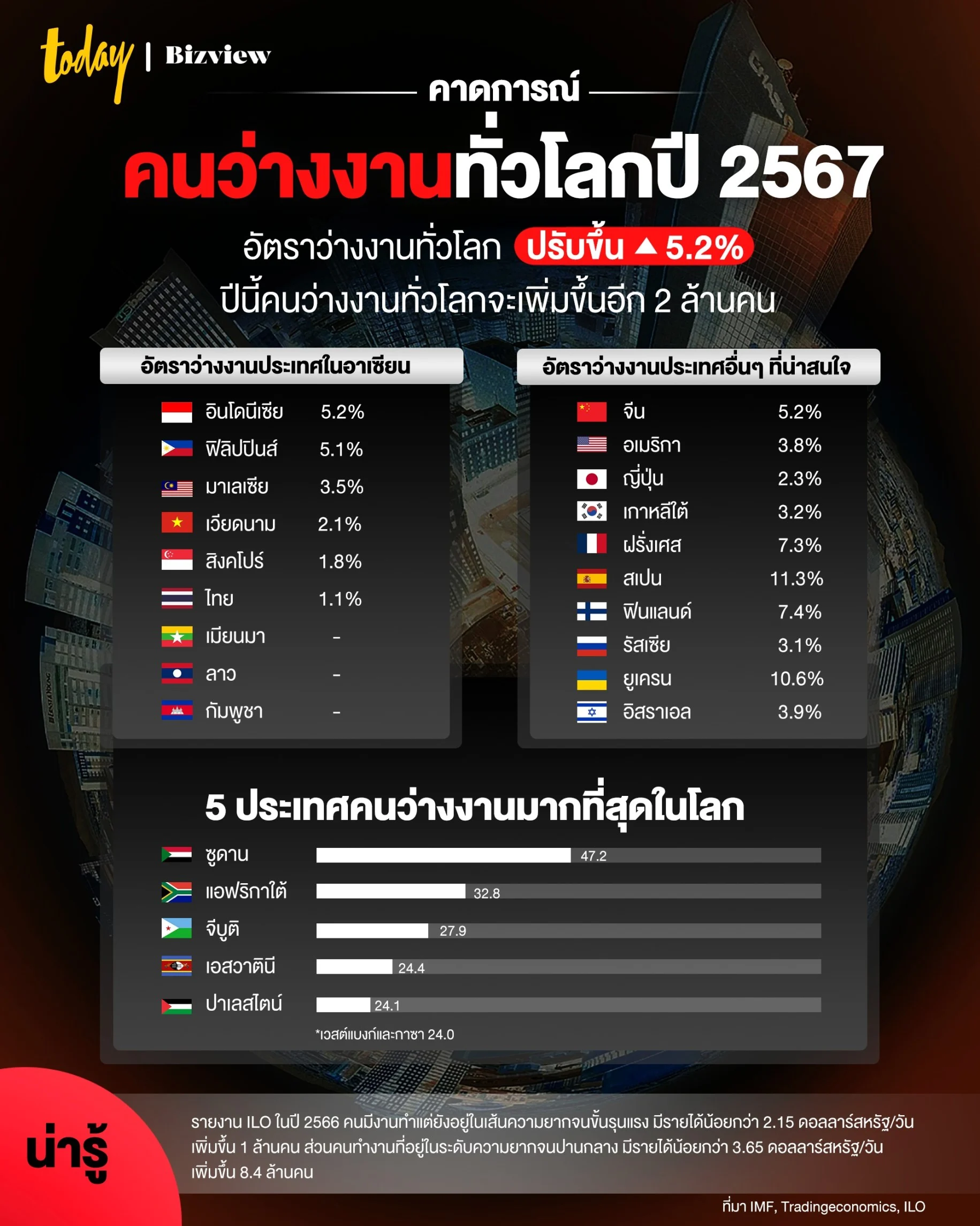 องค์กรแรงงานระหว่างประเทศ (International Labour Organization) หรื ILO หน่วยงานขององค์การสหประชาชาติ ออกรายงานแนวโน้มการจ้างงานและสังคมโลกในปี 2567 เมื่อวันที่ 10 มกราคมที่ผ่านมา คาดการณ์ว่าจำนวนผู้ว่างงานทั่วโลกจะเพิ่มขึ้นอีก 2 ล้านคน ส่งผลให้อัตราการว่างงานทั่วโลกเพิ่มขึ้นเฉลี่ยเป็น 5.2 % จาก 5.1 % ในปี 2566