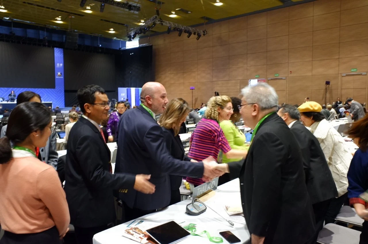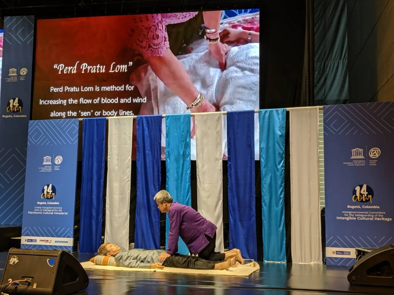 “การสาธิตการนวดไทย” บนเวทีการประชุมคณะกรรมการระหว่างรัฐบาลว่าด้วยการสงวนรักษามรดกภูมิปัญญาทางวัฒนธรรม(ICH) ขององค์การยูเนสโก เพื่อการประกาศขึ้นทะเบียน นวดไทย NuadThai เป็นรายการตัวแทนมรดกวัฒนธรรมที่จับต้องไม่ได้ของมนุษยชาติ (IntangibleCultural Heritage) จาก UNESCO ณ กรุงโบโกตา สาธารณรัฐโคลอมเบีย วันที่ 12 ธ.ุค.62