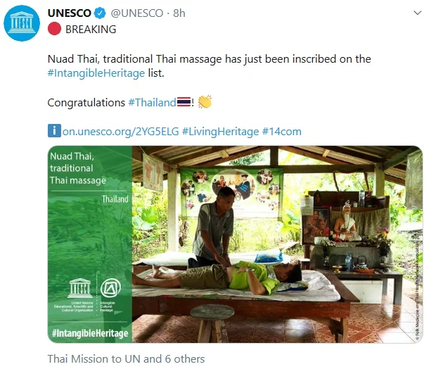 ยูเนสโก ประกาศขึ้นทะเบียน “นวดไทย” เป็น ICH มรดกวัฒนธรรมที่จับต้องไม่ได้ของมนุษยชาติแล้ว รายการที่สองต่อจาก “โขน” ที่ขึ้นไปแล้วเมื่อปลายปี 2561