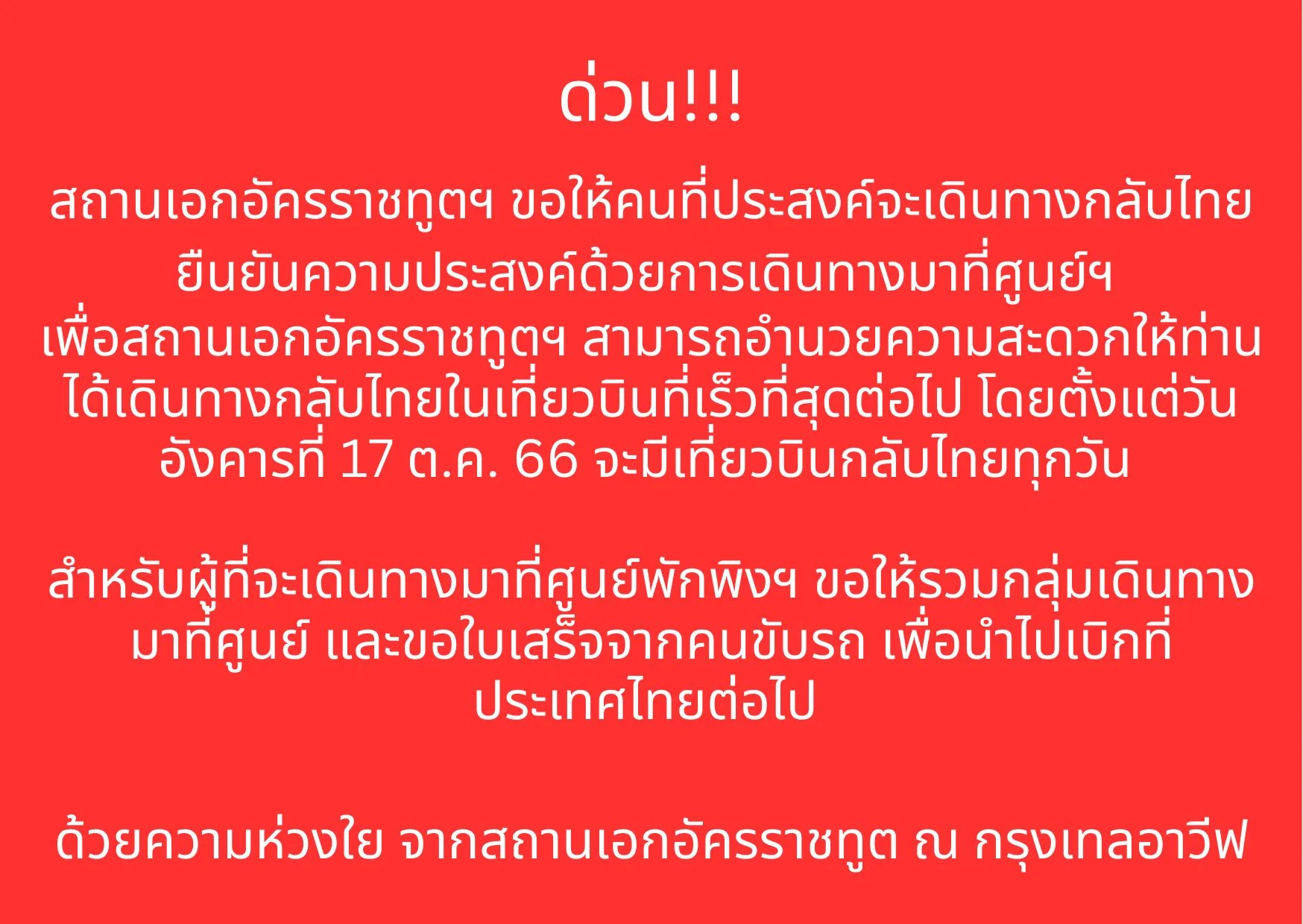 UPDATE สถานเอกอัครราชทูต ณ กรุงเทลอาวีฟ แจ้งว่า ตั้งแต่พรุ่งนี้ (17 ต.ค. 66) จะมีเที่ยวบินจากอิสราเอล กลับไทยทุกวัน