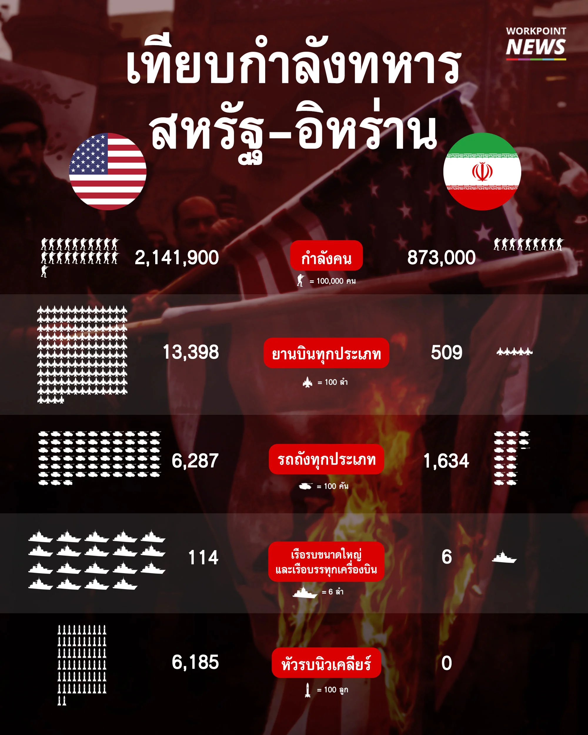สหรัฐฯ มีเครื่องบินรบทุกประเภทรวมกันกว่า 13,000 ลำ ในขณะที่อิหร่านมีแค่ 509 ลำ รถถังของสหรัฐฯ มีทั้งสิ้น 6,287 คัน ในขณะที่อิหร่านมีเพียง 1,634 คัน ส่วนกำลังทางน้ำ เฉพาะเรือบรรทุกเครื่องบินสหรัฐฯ มี 24 ลำ ส่วนอิหร่านไม่มีเลย นี่ยังไม่นับเทคโนโลยีทางการทหารอื่นๆ ที่สหรัฐฯ ล้ำหน้ากว่ามาก รวมถึงมีอาวุธนิวเคลียร์ที่อิหร่านไม่มี