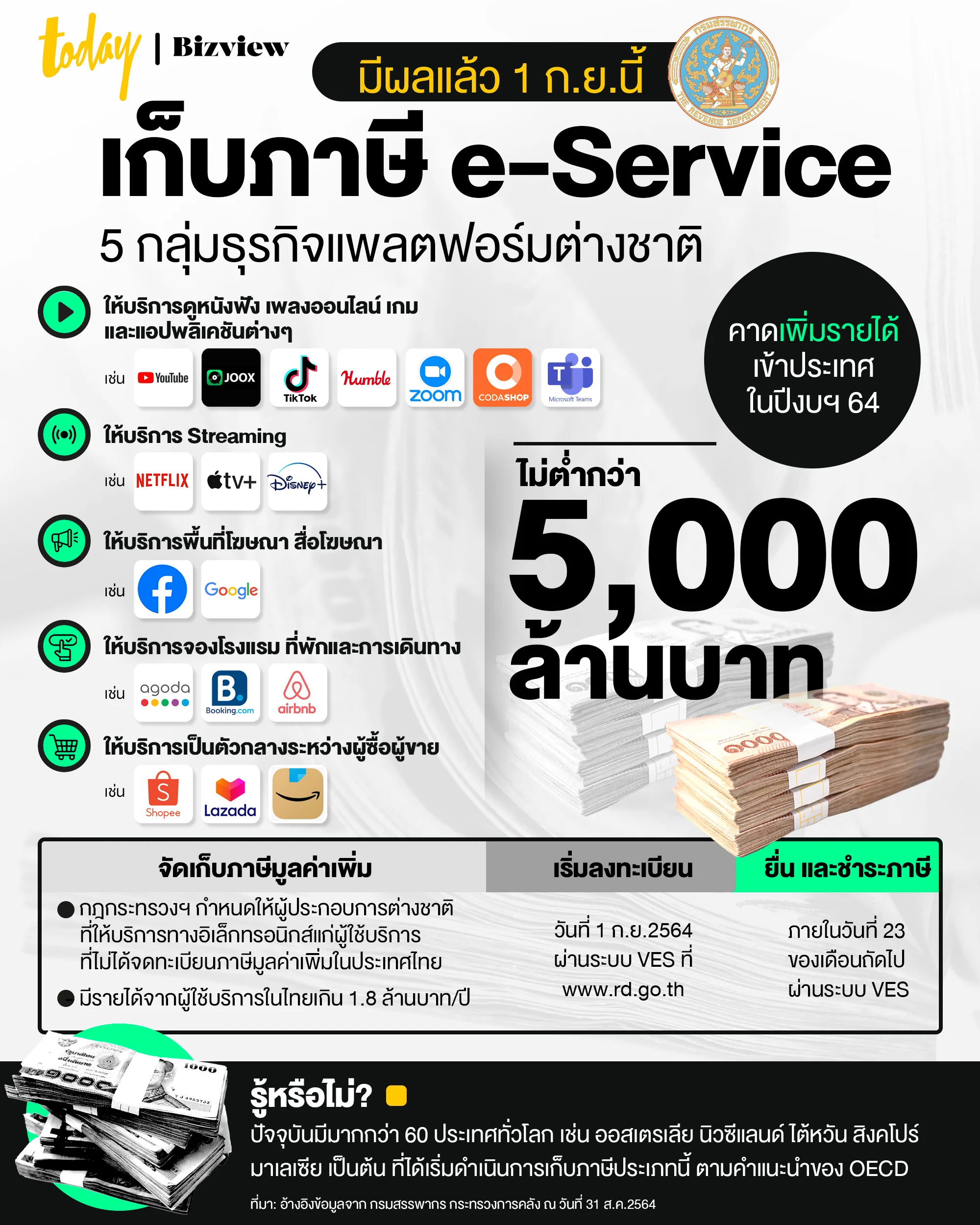 หลังจากได้ลงนามกฎกระทรวงฉบับที่ 377 (พ.ศ.2564) ออกตามความในประมวลรัษฎากร ว่าด้วยการดำเนินการเกี่ยวกับเอกสารหลักฐานและทะเบียนภาษีมูลค่าเพิ่มด้วยกระบวนการทางอิเล็กทรอนิกส์ สำหรับผู้ประกอบการที่ได้ให้บริการทางอิเล็กทรอนิกส์ รวมทั้งผู้ประกอบการที่ให้บริการอิเล็กทรอนิกส์แพลตฟอร์มจากต่างประเทศ เพื่อกำหนดวิธีการดำเนินงานในการจัดเก็บภาษีมูลค่าเพิ่มสำหรับการให้บริการทางอิเล็กทรอนิกส์จากต่างประเทศ (e – Service) ของกรมสรรพากร ซึ่งจะเริ่มมีผลบังคับใช้ทางกฎหมายในวันที่ 1 ก.ย.นี้