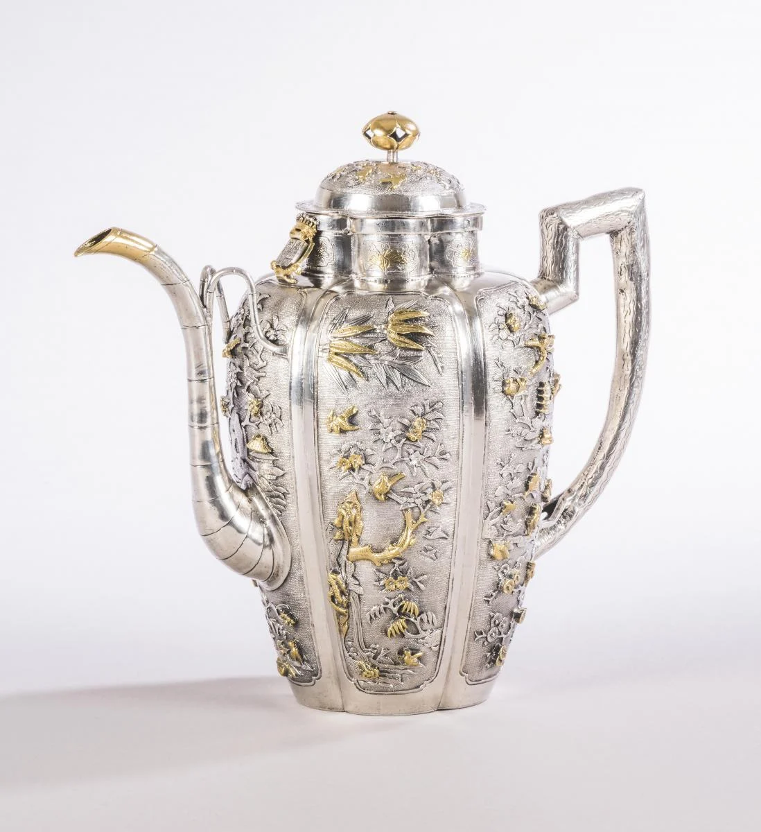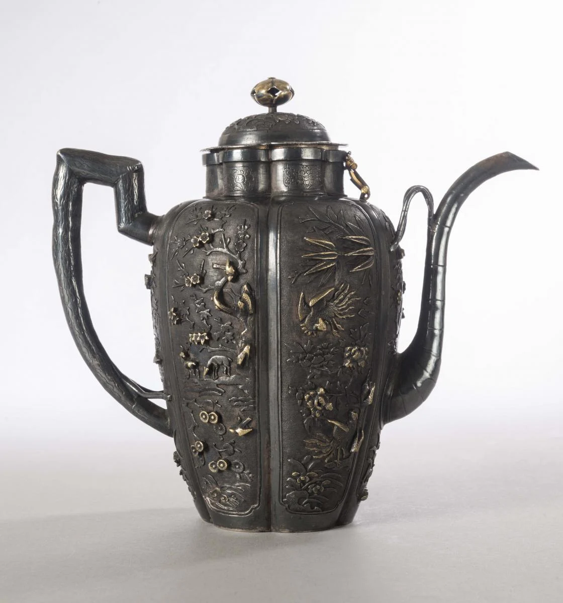การตกแต่งกาน้ำนั้นประดับทองคำเป็นรูปพืชพรรณธรรมชาติ นก ผีเสื้อ และเจดีย์ ส่วนหูจับและพวยกานั้นตกแต่งเลียนแบบเนื้อไม้และไม้ไผ่