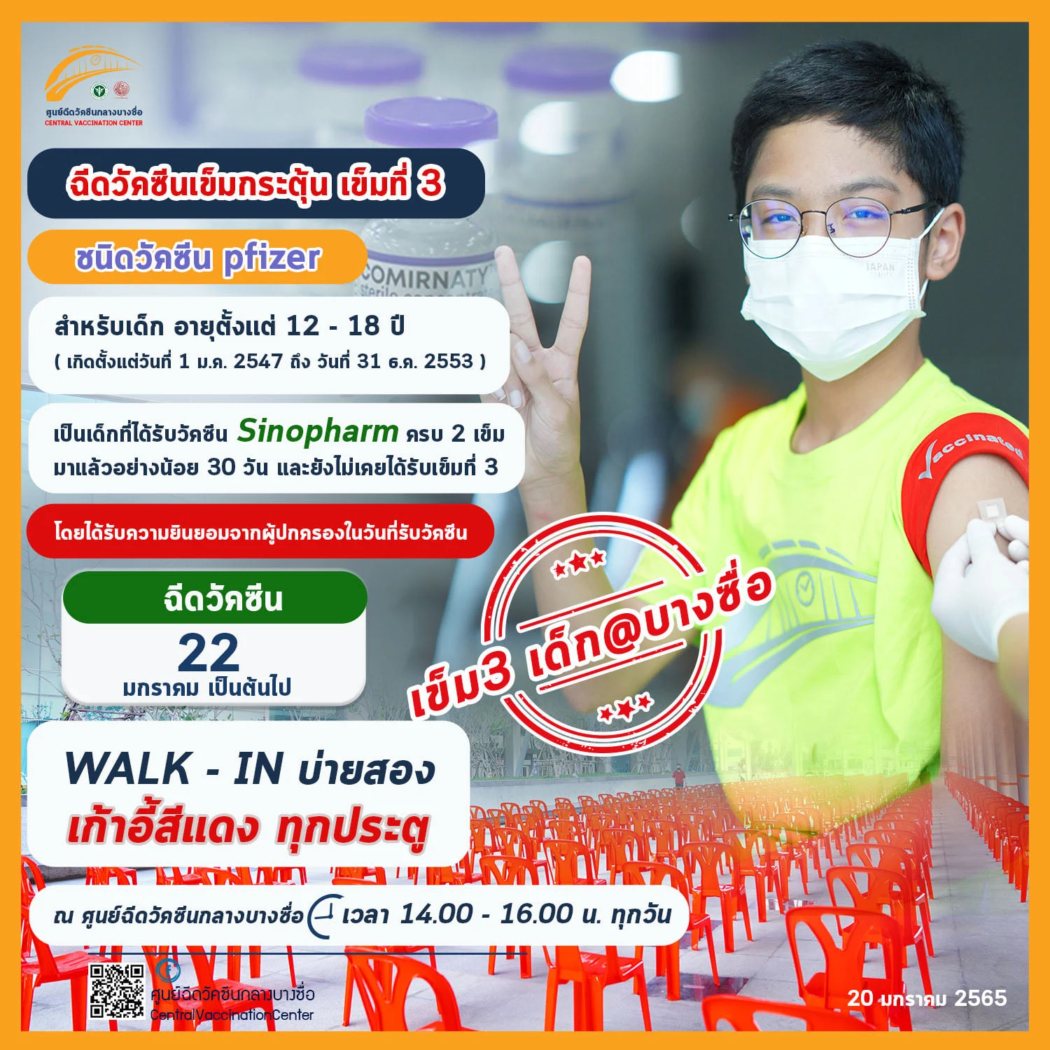เช็กเงื่อนไข Walk in ฉีดเข็ม 3 ไฟเซอร์สำหรับเด็กอายุ 12-18 ปี ที่ศูนย์ฉีดวัคซีนกลางบางซื่อ เริ่ม 22 ม.ค.นี้