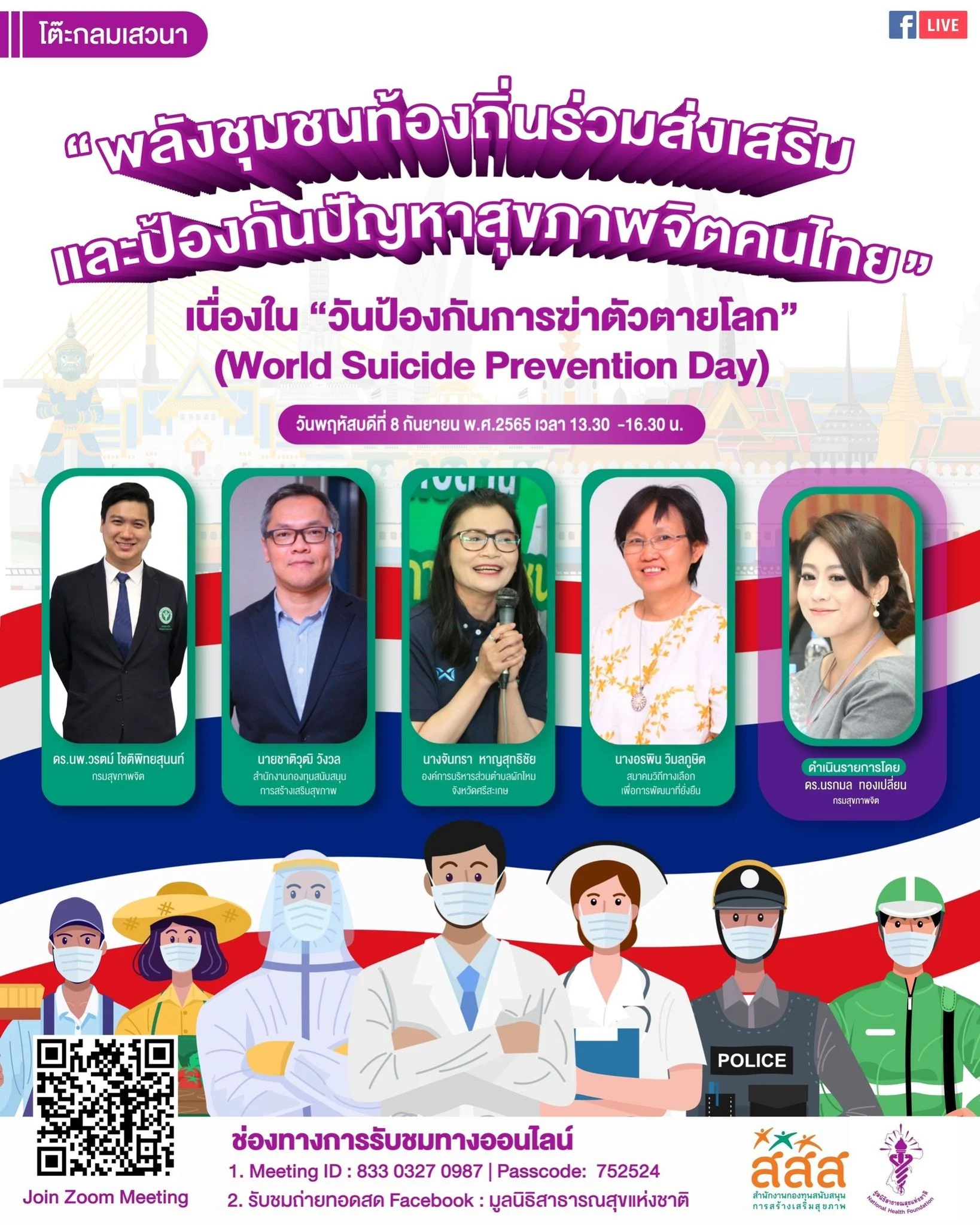 สำนักงานกองทุนสนับสนุนการสร้างเสริมสุขภาพ (สสส.) ร่วมกับ มูลนิธิสาธารณสุขแห่งชาติ (มสช.) จัดเวทีโต๊ะกลมเสวนาออนไลน์ “พลังชุมชนท้องถิ่นร่วมส่งเสริมและป้องกันปัญหาสุขภาพจิตคนไทย” เพื่อกระตุกสังคมไทยให้ความสำคัญและร่วมแก้ไขปัญหาการฆ่าตัวตายโดยเริ่มจากตัวเอง เนื่องในวัน “วันป้องกันการฆ่าตัวตายโลก” (World Suicide Prevention Day) 10 กันยายน หลังพบอัตราการฆ่าตัวตายของคนไทยเพิ่มสูงขึ้นจากสถานการณ์โควิด ด้านแพทย์ระบุอีก 10 ปี ปัญหาสุขภาพจิตแซงหน้าโรคไม่ติดต่อทั้งหมด สร้างความสูญเสียขึ้นเป็นอันดับ 1 พร้อมชู อบต.ผักไหม จ.ศรีสะเกษ ชุมชนต้นแบบการส่งเสริมสุขภาพจิต โดยได้รับเกียรติจาก กรมสุขภาพจิต กระทรวงสาธารณสุข (สธ.) และภาคีเครือข่าย อาทิ สมาคมวิถีทางเลือกเพื่อการพัฒนาที่ยั่งยืน ร่วมวงเสวนา