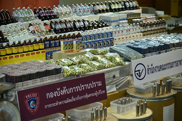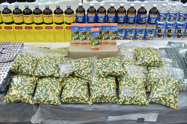 วันที่ 3 ก.ค.พล.ต.ท.เพิ่มพูน ชิดชอบ ผู้ช่วยผู้บัญชาการตำรวจแห่งชาติ พร้อมด้วย นพ.ไพศาล ดั่นคุ้ม เลขาธิการคณะกรรมการอาหารและยา (อย.) ร่วมกันแถลงผลการทลายแหล่งลักลอบผลิตยาสัตว์เถื่อนโดยไม่ได้รับอนุญาต