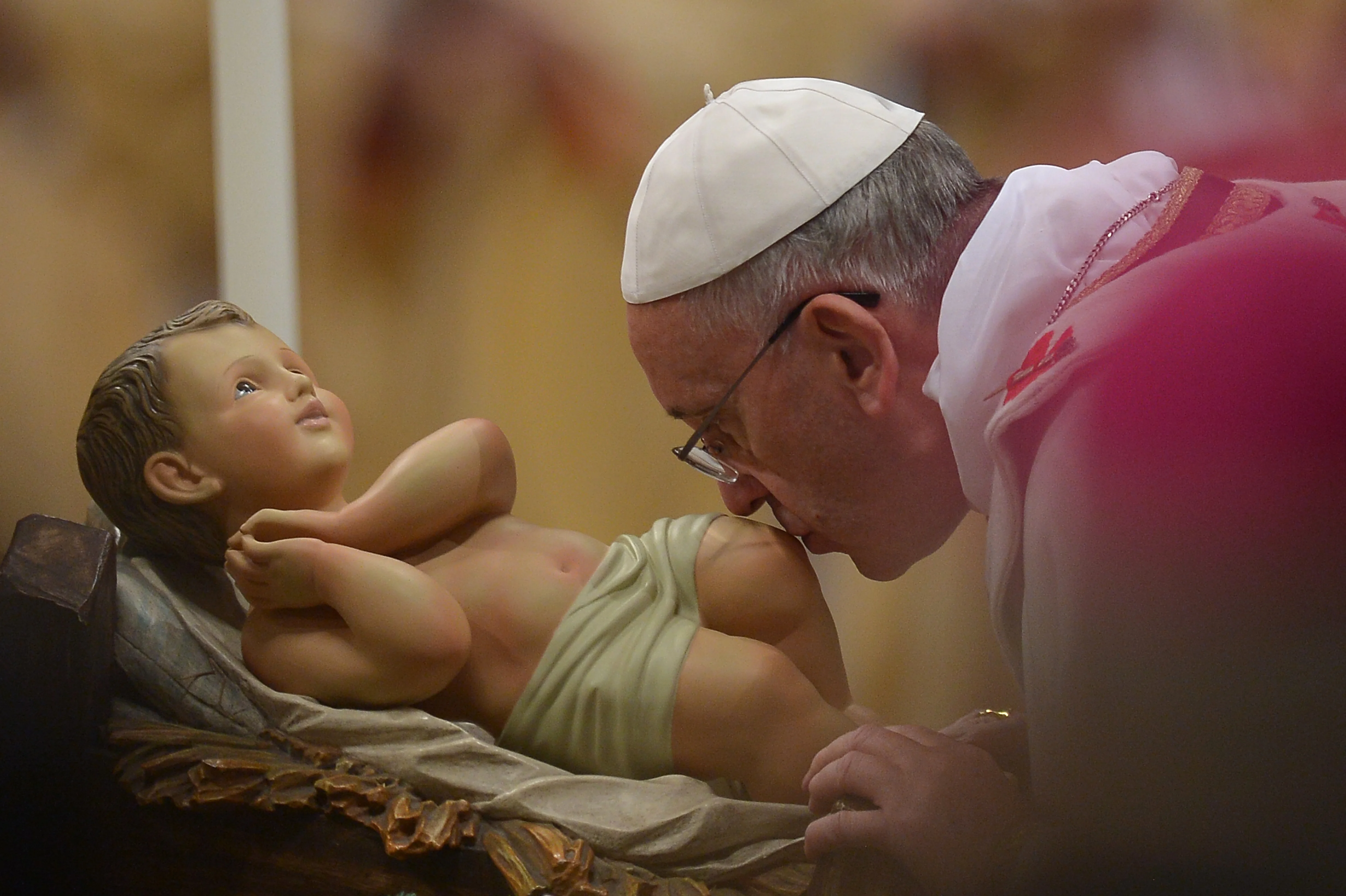 Pope Francis kisses the unveiled baby Jesus during a Christmas Eve mass at St Peter’s Basilica to mark the nativity of Jesus Christ, on December 24, 2013 at the Vatican. AFP PHOTO / FILIPPO MONTEFORTE (Photo by FILIPPO MONTEFORTE / AFP)
