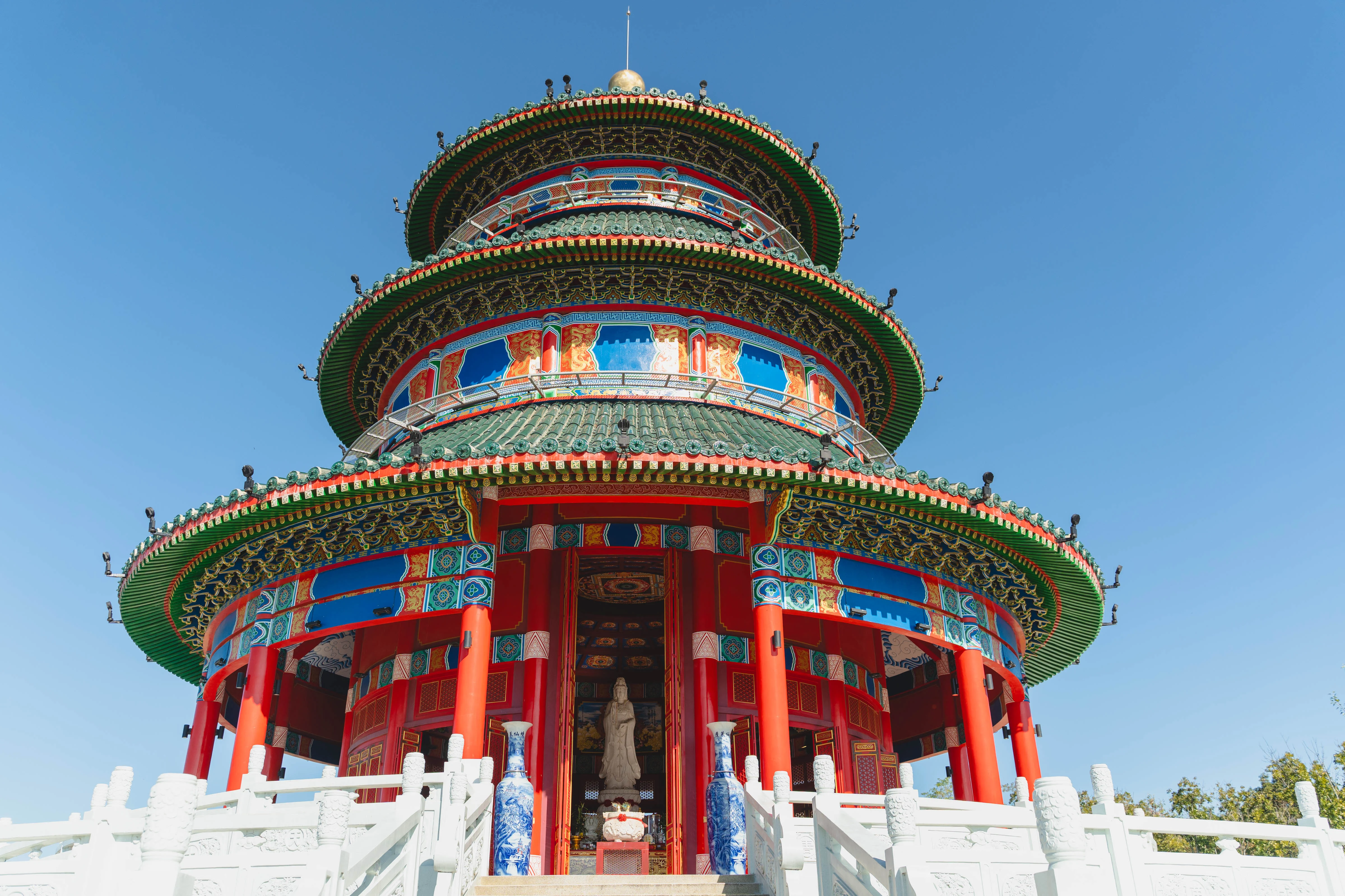 ‘เทียนไท’ เล่าว่า ท่านประธาน มองว่า เทียนถานเป็นพื้นที่ศักดิ์สิทธิ์ที่คนทั่วไปในอดีตเข้าไม่ได้ ก็เลยคิดว่ารูปแบบลักษณะนี้ เหมาะกับการประดิษฐานองค์พระโพธิสัตว์กวนอิม นอกจากนี้ยังมีการผสานความเชื่อดั้งเดิมเข้ากับเทคโนโลยีสมัยใหม่ โดยตัววิหารถูกออกแบบเป็น ผังวงกลม หลังคาซ้อน 3 ชั้น มุงด้วยกระเบื้องสีเขียว ซึ่งเป็น กระเบื้องโซลาร์เซลล์ชนิดฟิล์มบาง ประกบกระจกเทมเปอร์ 2 ชั้น