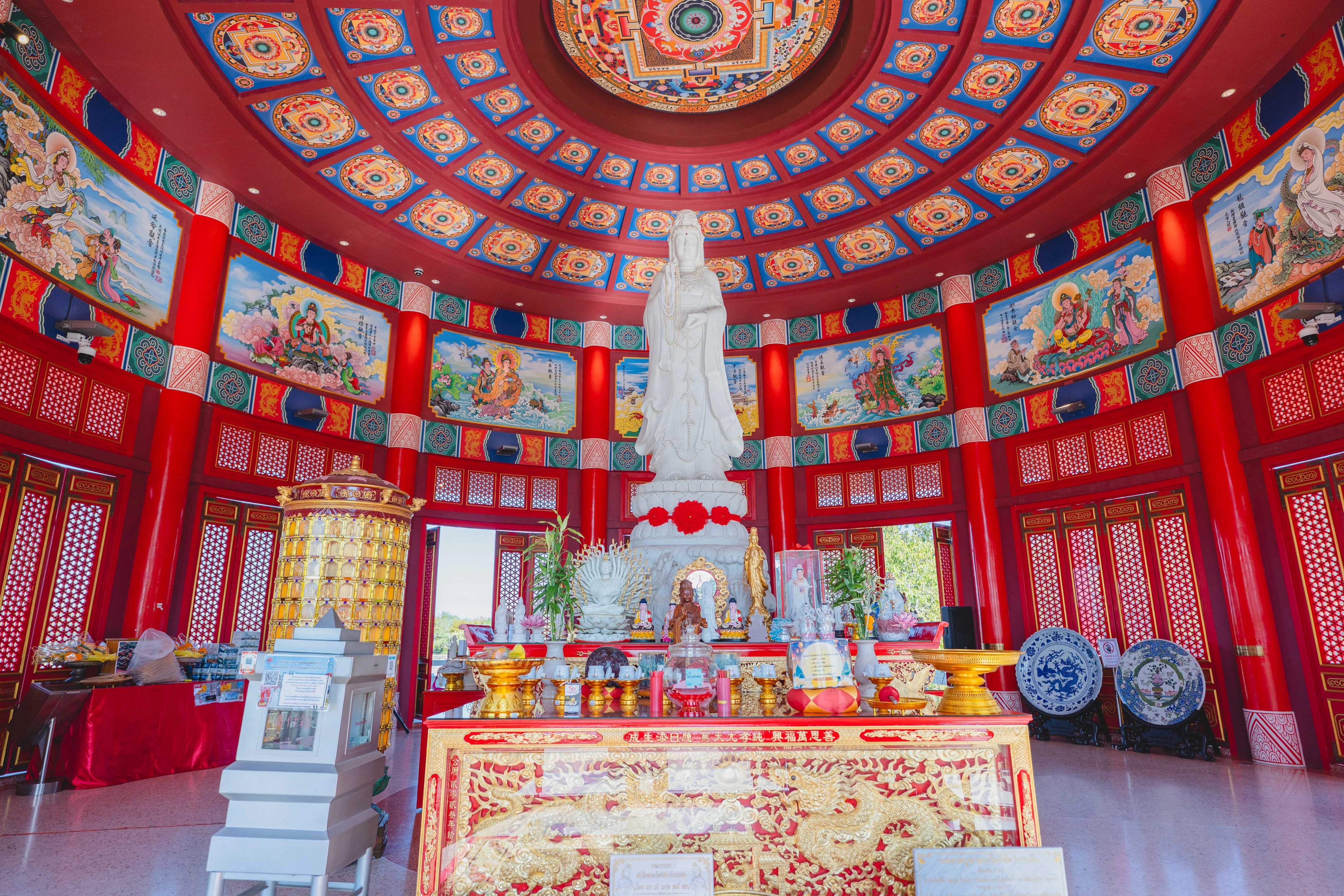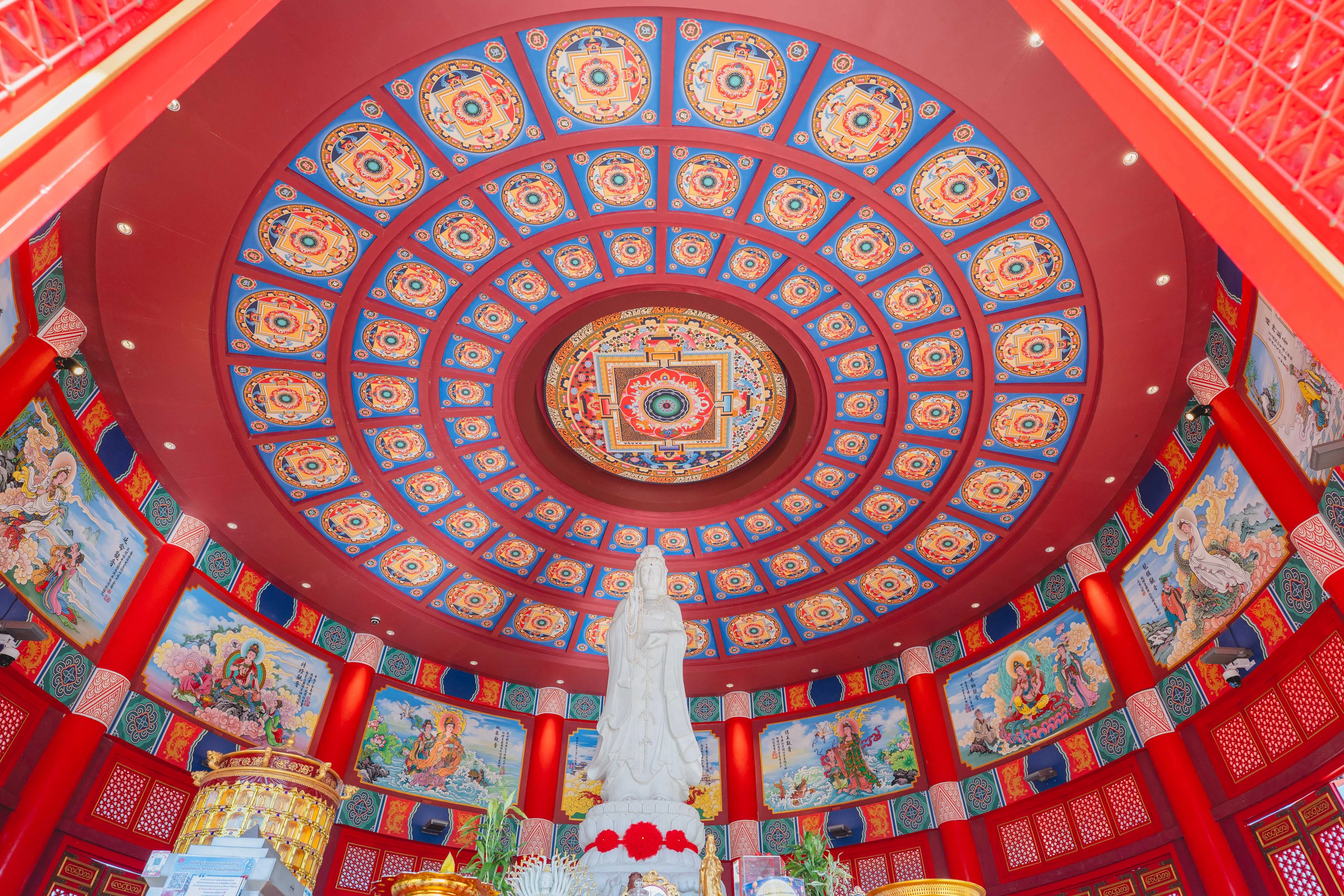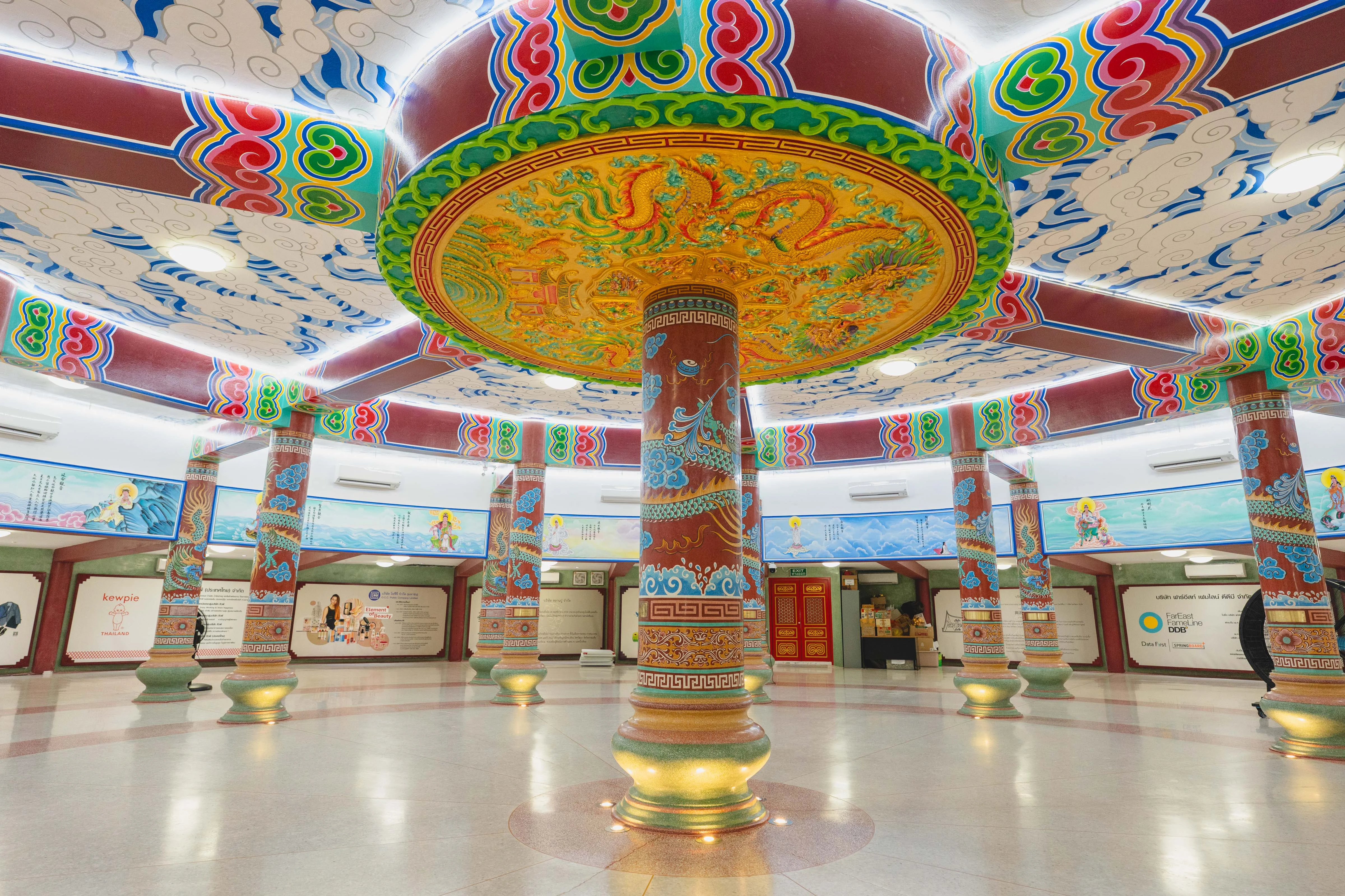 ภายในวิหารเต็มไปด้วยสัญลักษณ์เชิงมงคลและความหมายทางจิตวิญญาณ ตั้งแต่ชั้นใต้ดินที่มีเสาทั้งหมด 12 ต้น แทน 12 เดือน และเสาวงนอกอีก 12 ต้น แทนเวลา 12 ชั่วยาม ฝ้าเพดานตกแต่งด้วยลวดลาย มันดาลา (Mandala) หรือ “มณฑล” สัญลักษณ์แห่งการตรัสรู้ในพุทธนิกายวัชรยาน (ทิเบต) โดยรอบยังประดิษฐานองค์พระโพธิสัตว์กวนอิมปางต่าง ๆ รวม 11 ปาง ขณะที่ด้านบนสุดติดตั้ง เสาล่อฟ้า ซึ่งคุณเทียนไทอธิบายว่า เป็นสัญลักษณ์ของการเชื่อมต่อพลังระหว่างฟ้าและโลกมนุษย์