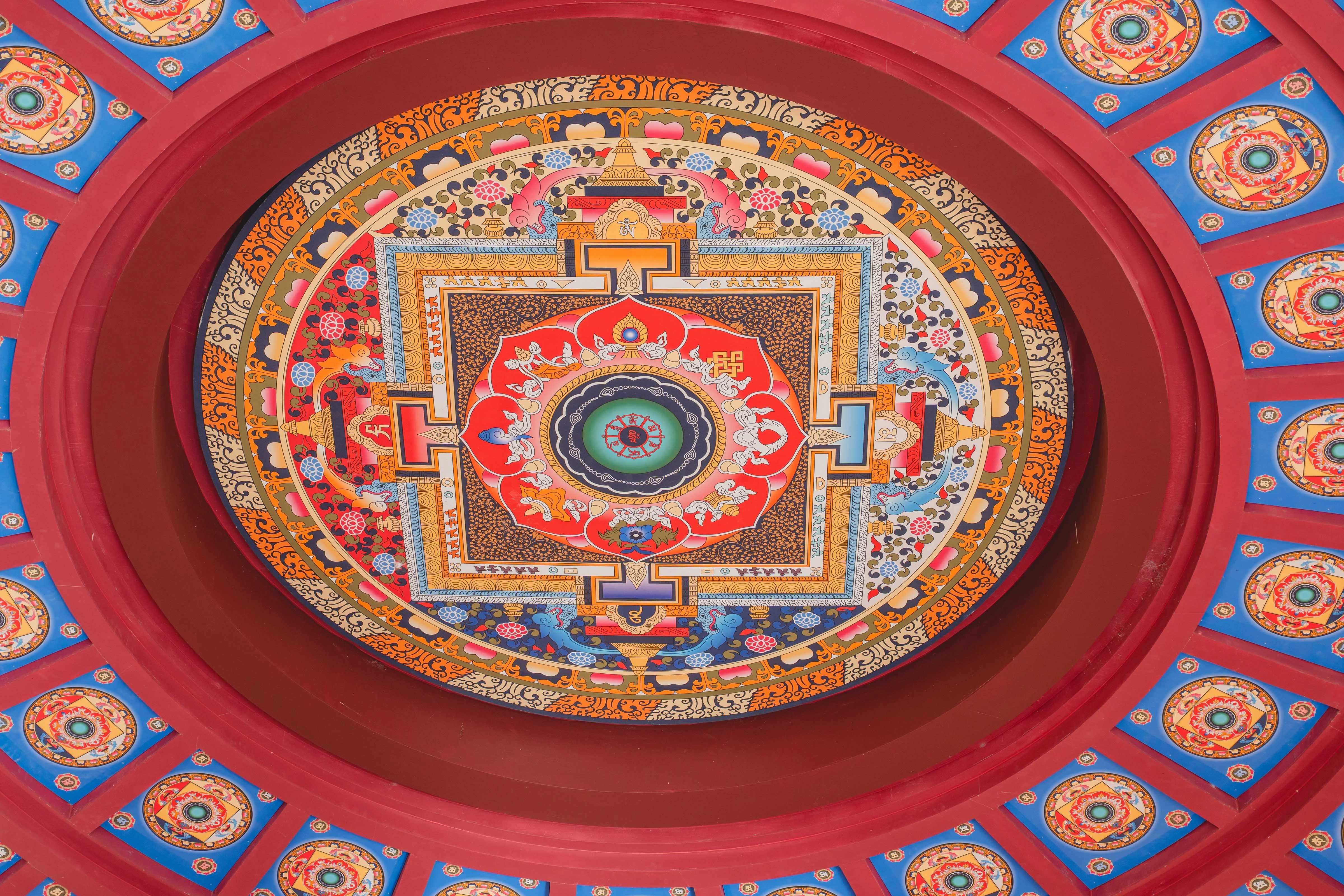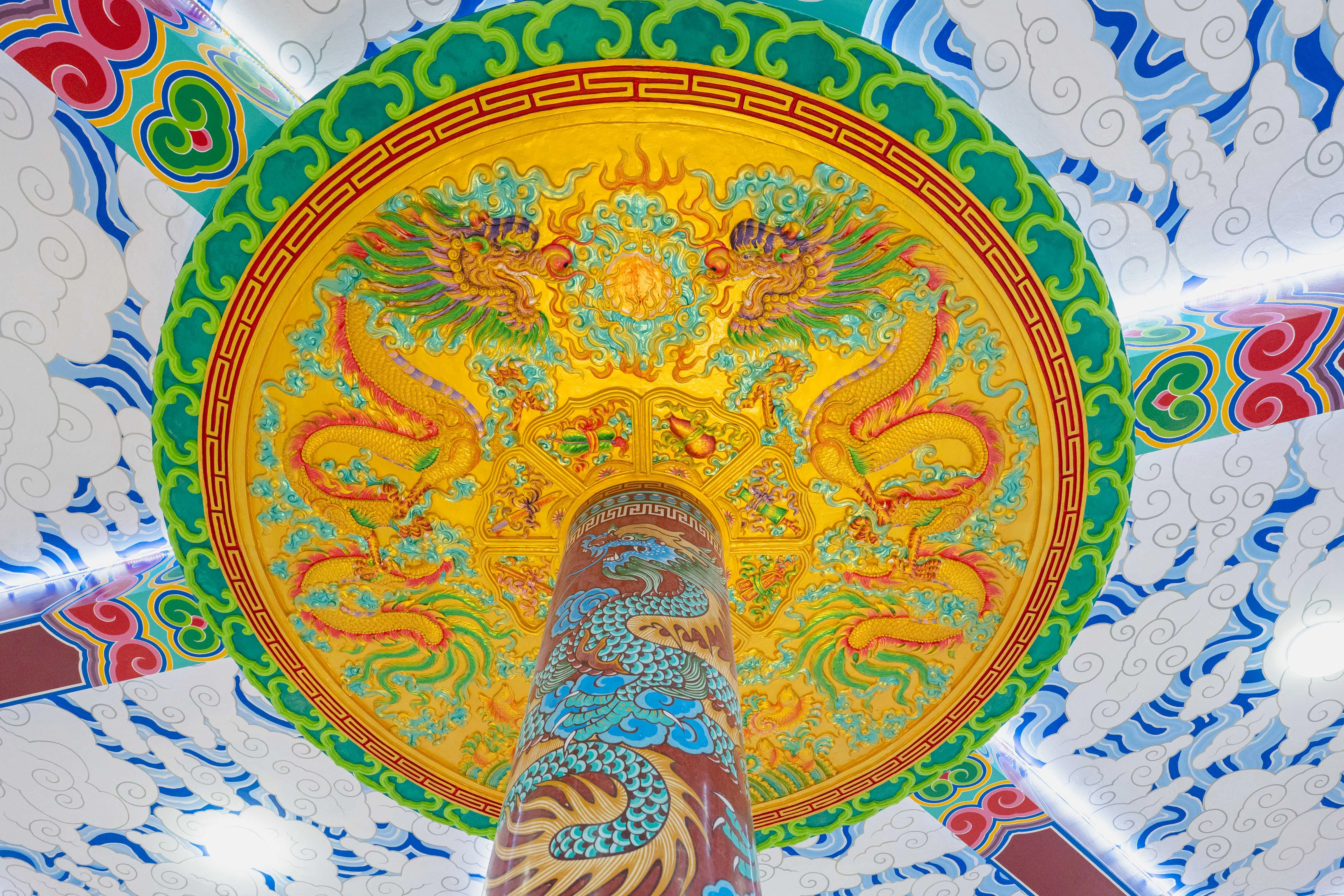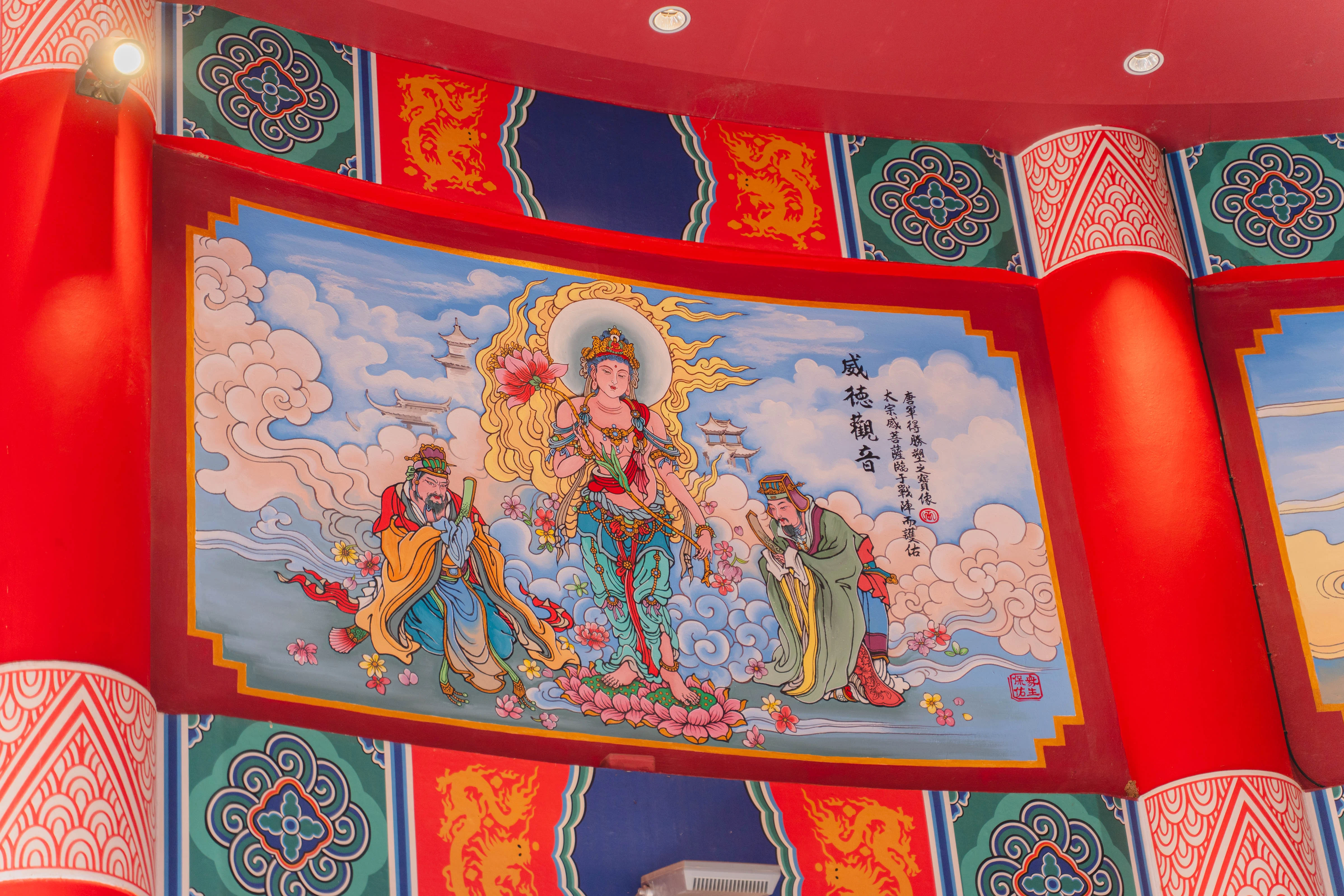 ภายในวิหารเต็มไปด้วยสัญลักษณ์เชิงมงคลและความหมายทางจิตวิญญาณ ตั้งแต่ชั้นใต้ดินที่มีเสาทั้งหมด 12 ต้น แทน 12 เดือน และเสาวงนอกอีก 12 ต้น แทนเวลา 12 ชั่วยาม ฝ้าเพดานตกแต่งด้วยลวดลาย มันดาลา (Mandala) หรือ “มณฑล” สัญลักษณ์แห่งการตรัสรู้ในพุทธนิกายวัชรยาน (ทิเบต) โดยรอบยังประดิษฐานองค์พระโพธิสัตว์กวนอิมปางต่าง ๆ รวม 11 ปาง ขณะที่ด้านบนสุดติดตั้ง เสาล่อฟ้า ซึ่งคุณเทียนไทอธิบายว่า เป็นสัญลักษณ์ของการเชื่อมต่อพลังระหว่างฟ้าและโลกมนุษย์