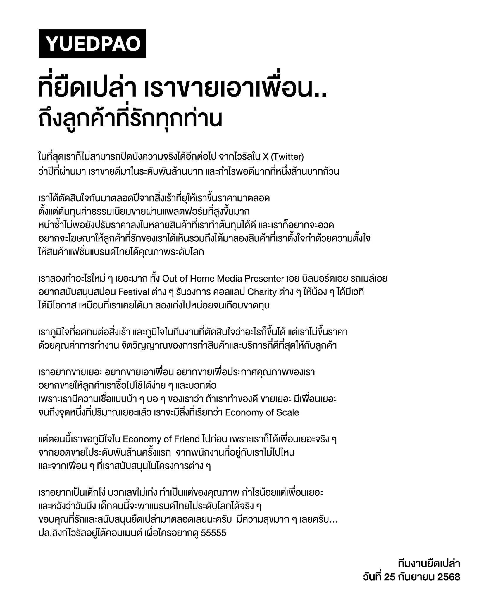 โดยเนื้อหาในแถลงการณ์ได้พูดถึงเหตุผล และความคิดจากทีมงานยืดเปล่าอย่างตรงไปตรงมา ส่วนหนึ่งของใจความแถลงการณ์ได้อธิบายว่า “เราได้ลองทำอะไรใหม่ๆ ทั้ง out of home media presenter เอย บิลบอร์ดเอย รถเมล์เอย อยากสนับสนุนสปอน festival ต่างๆ รันวงการ คอลแลป charity ต่างๆ ให้น้องๆ ได้มีเวที ได้มีโอกาส เหมือนที่เราเคยได้มา ลองเก่งไปหน่อยจนเกือบขาดทุน”