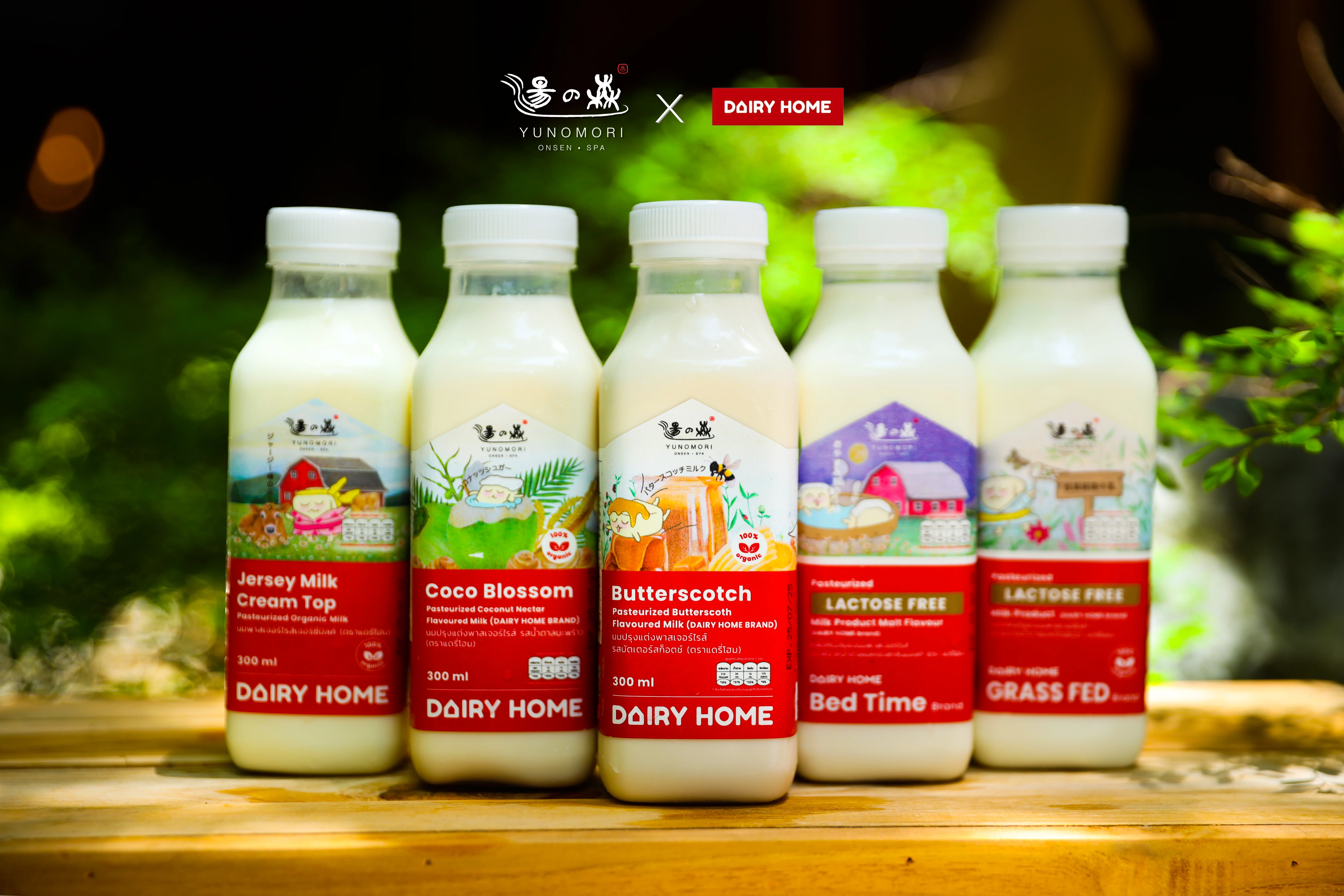 เปิดตัวนม 5 รสชาติยอดนิยมของ Dairy Home ได้แก่ Bed Time, Grass Fed, Butterscotch, Coco Blossom และ Jersey Milk Cream Top พร้อมฉลากดีไซน์พิเศษที่มีมาสคอตสุดน่ารัก “Yutofu-chan” วางจำหน่ายเฉพาะที่ Yunomori Onsen & Spa
